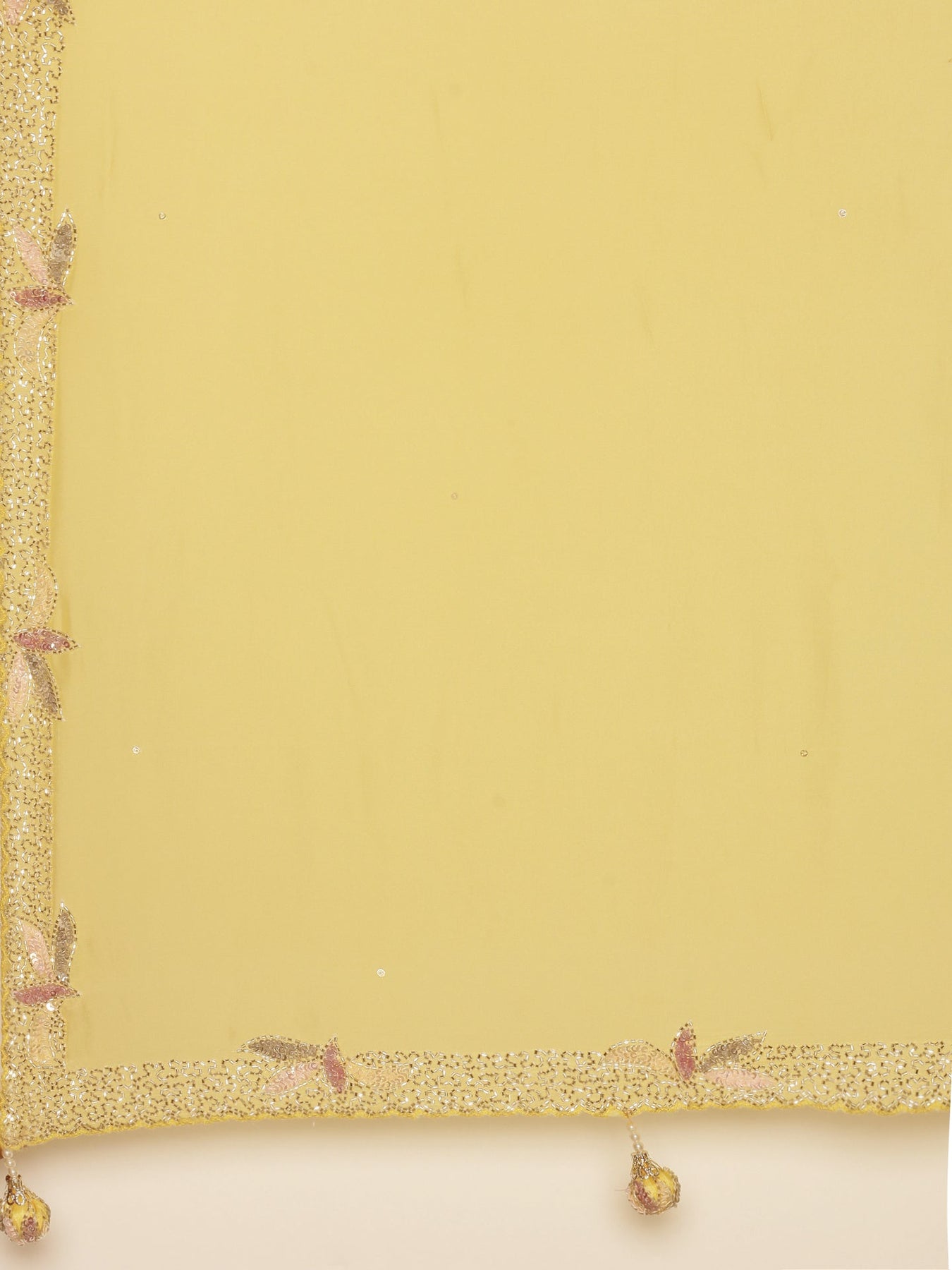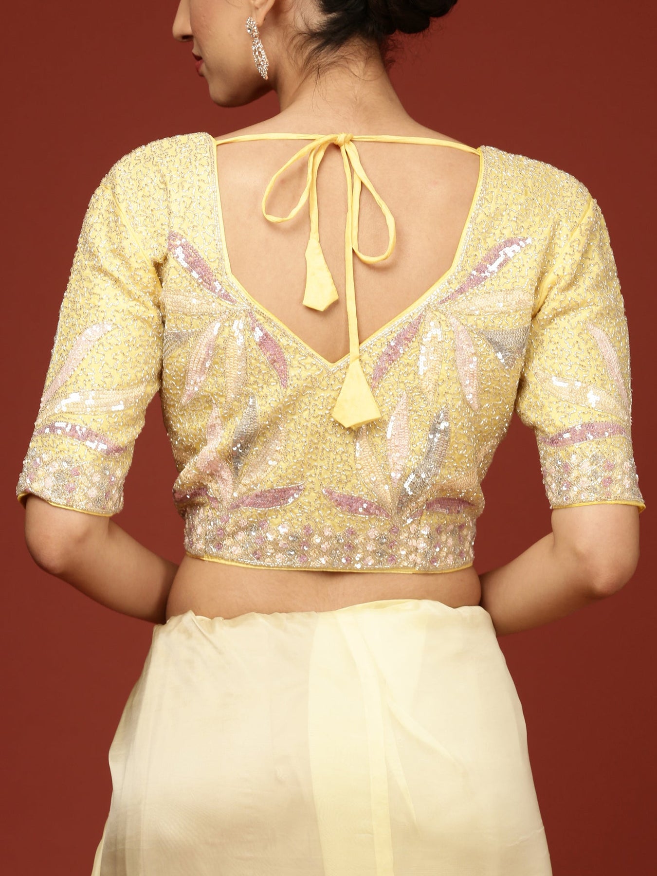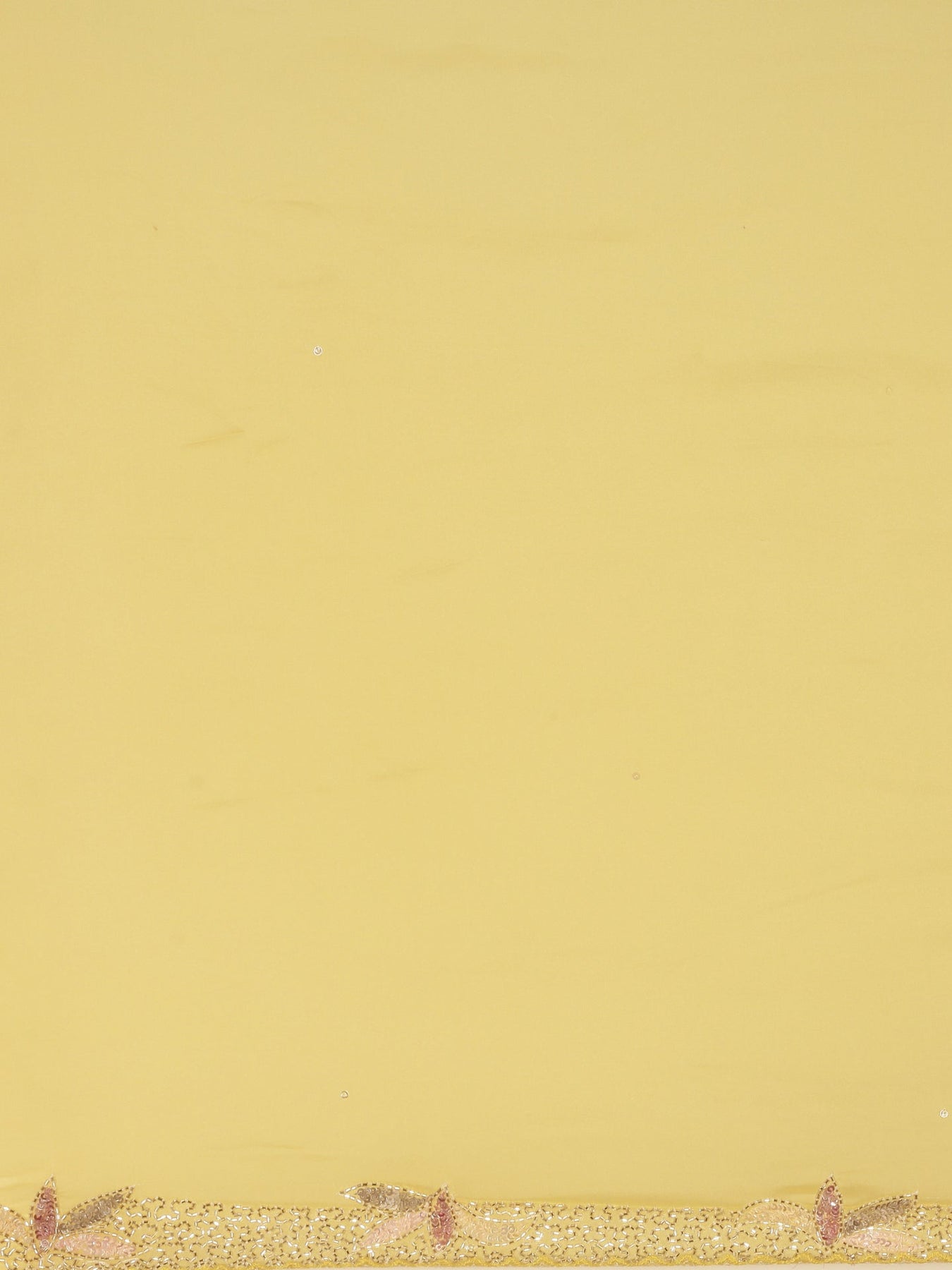 Elevate your style with this lemon crepe saree adorned with delicate sequins that shimmer gracefully. Designed for effortless elegance, it comes with a ready-made blouse, ensuring a perfect fit and convenience. Ideal for festive occasions or evening gatherings, this saree combines comfort with a refined, contemporary charm.