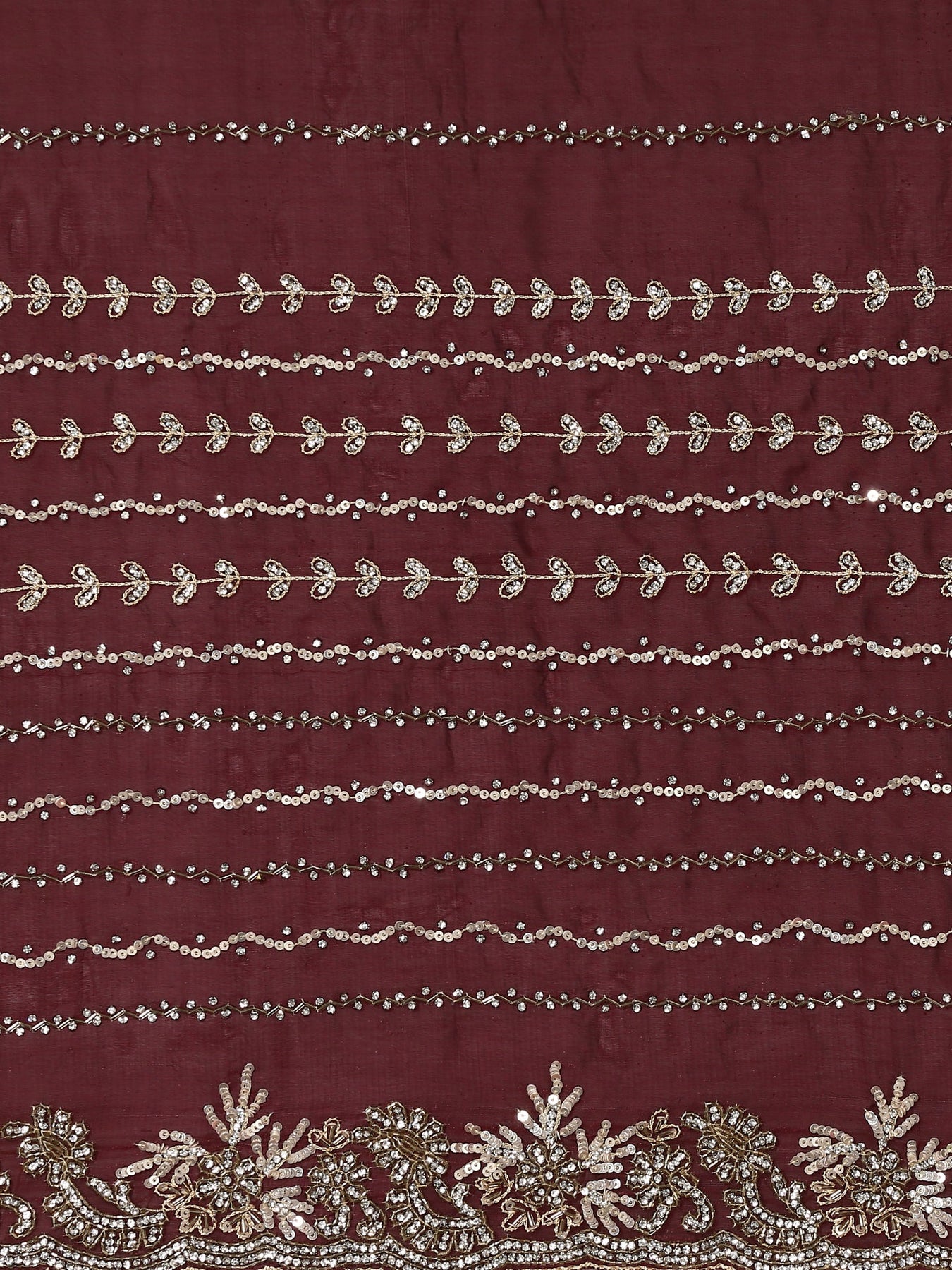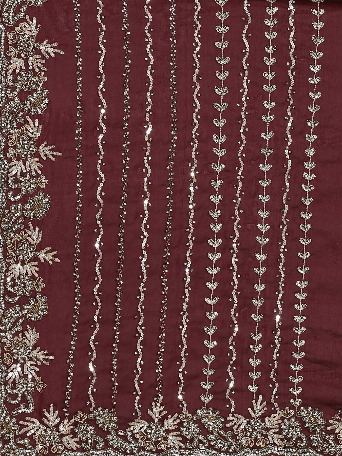 Elevate your elegance with this Maroon Saree, exquisitely hand-embroidered using fine Swarovski crystals and cut dana. The intricate detailing adds a refined shimmer, perfect for special occasions and formal events. Its rich maroon hue complements the artistry, ensuring you stand out with understated sophistication and timeless style.