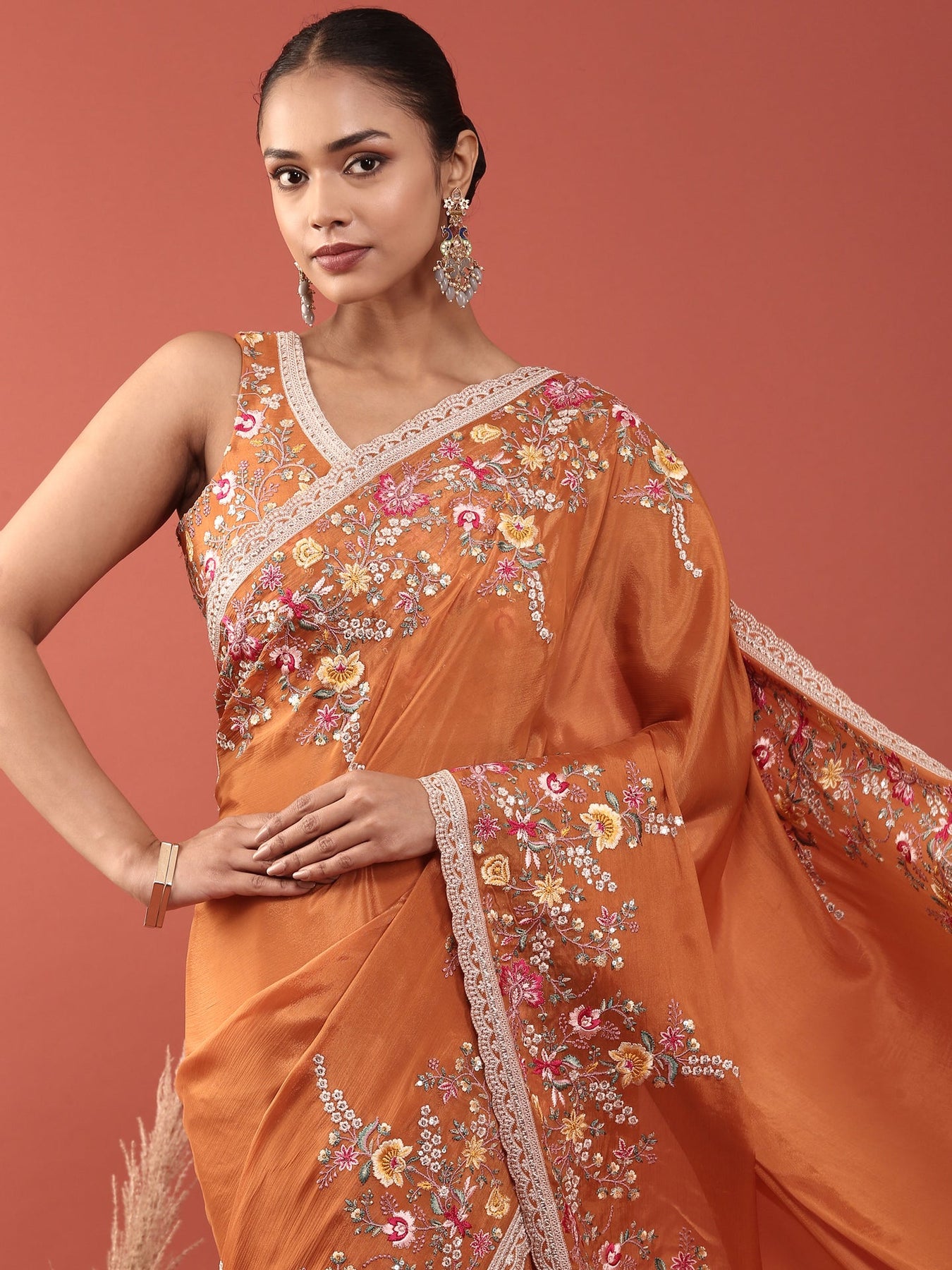 Orange Crepe Embroidery Saree With Readymade Blouse