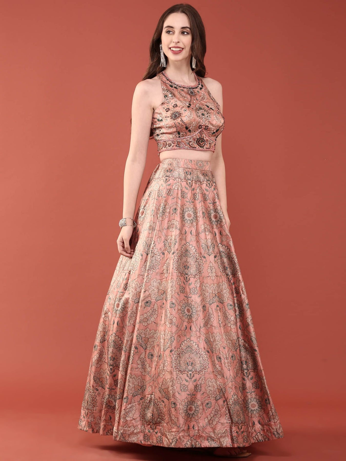 Elevate your ethnic wardrobe with this exquisite peach silk ghagra set, meticulously crafted for the discerning wearer. The ensemble features luxurious silk fabric adorned with intricate beadwork and vibrant digital prints that showcase contemporary design sensibilities. The flowing ghagra silhouette offers graceful movement and timeless elegance, while the beaded embellishments add a touch of sophistication. Perfect for weddings, festive celebrations, or special occasions, this set combines traditional craftsmanship with modern aesthetics. The peach hue complements various skin tones beautifully, making it a versatile choice for your celebration wardrobe.