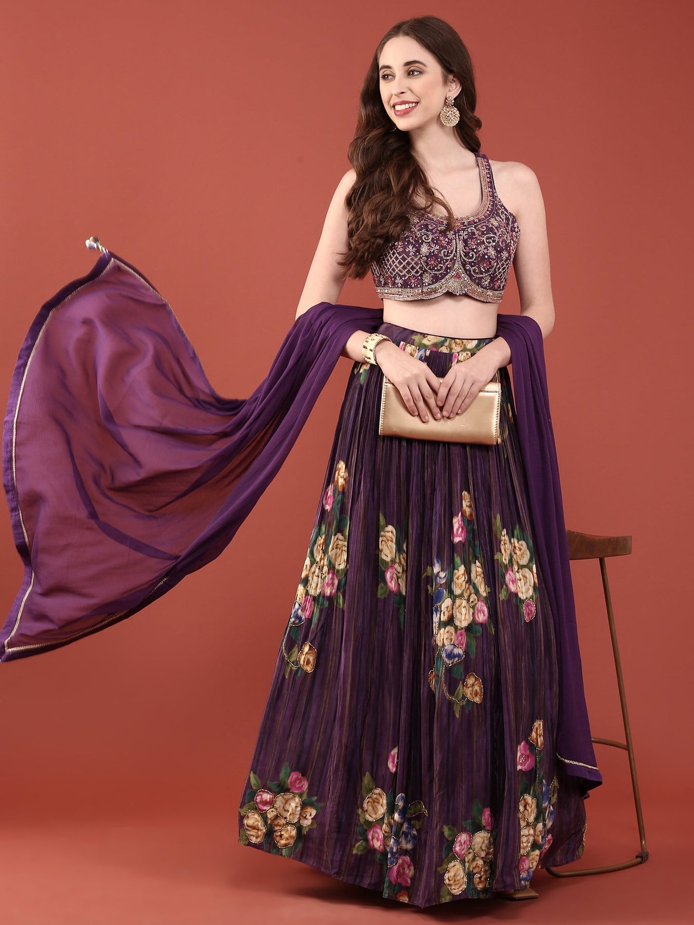 Elevate your ethnic wardrobe with this exquisite purple crepe ghagra set, meticulously crafted with intricate hand embroidery. The flowing silhouette and rich hue create an understated elegance, while the detailed embroidered work showcases traditional artistry. Perfect for weddings, celebrations, and special occasions, this ensemble combines timeless grace with contemporary styling. The breathable crepe fabric ensures comfort throughout your event, making it an ideal choice for the discerning woman who appreciates refined craftsmanship and cultural heritage.