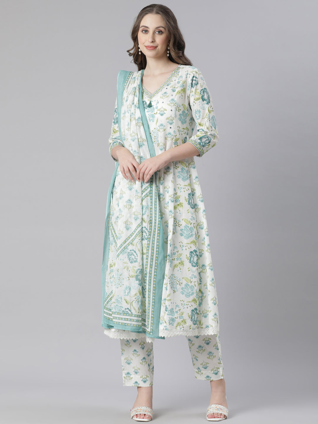 Neerus Green Printed Anarkali Kurta and Trousers With Dupatta