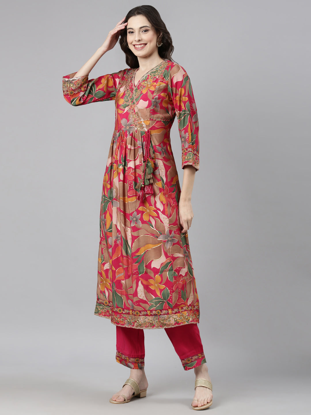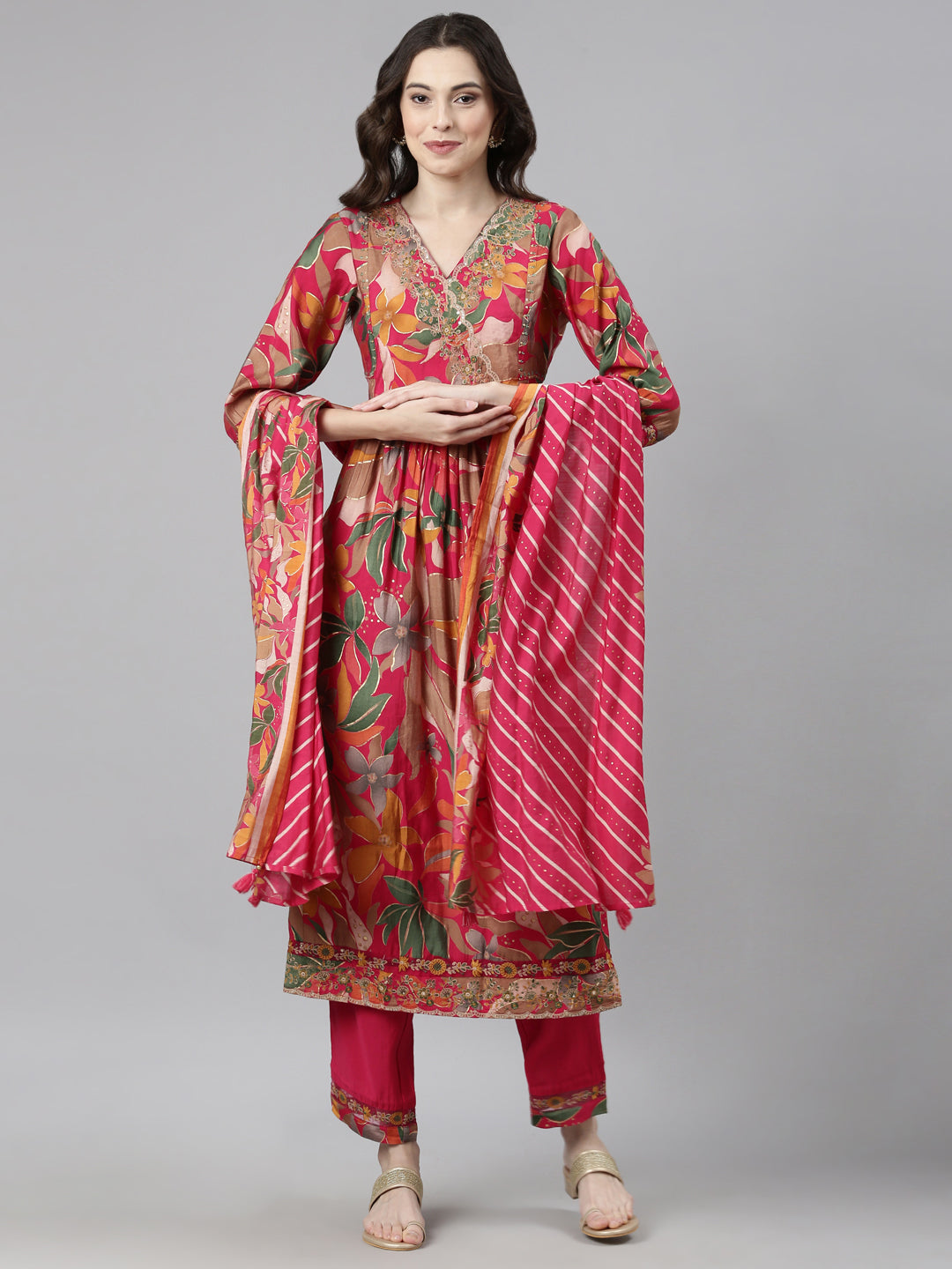 Neerus Pink Casual Floral Anarkali Kurta and Trousers With Dupatta