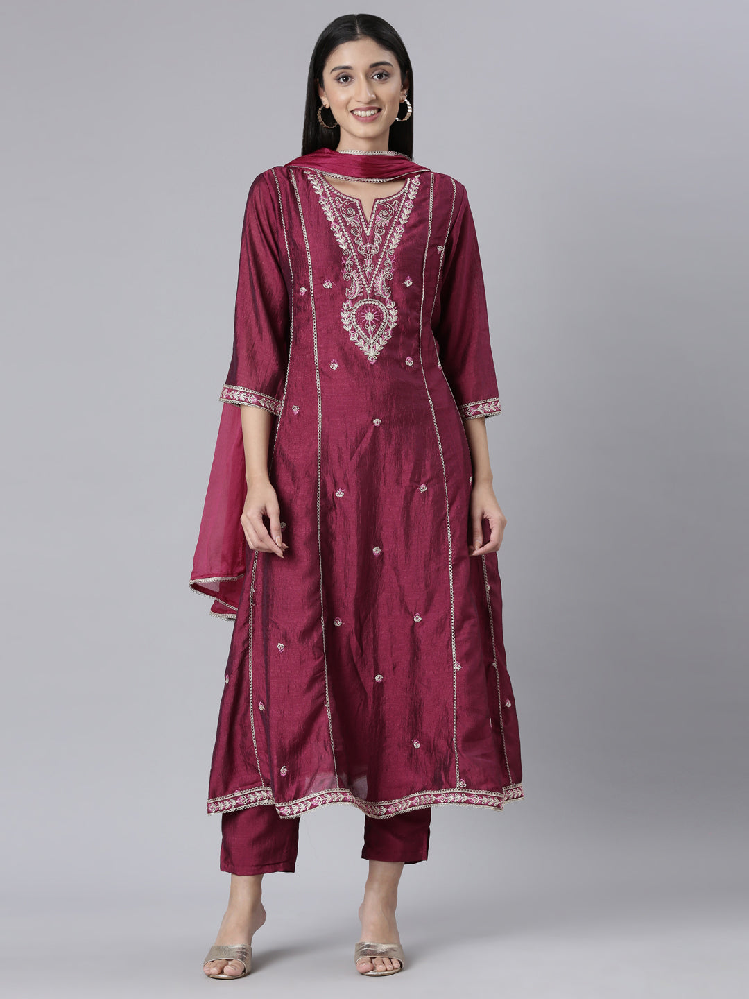 Elevate your ethnic wardrobe with the Neerus Purple Embroidered Anarkali Kurta and Trousers With Dupatta. The stunning embroidery adds a touch of elegance to this traditional outfit. Perfect for special occasions, this ensemble will make you feel confident and beautiful.