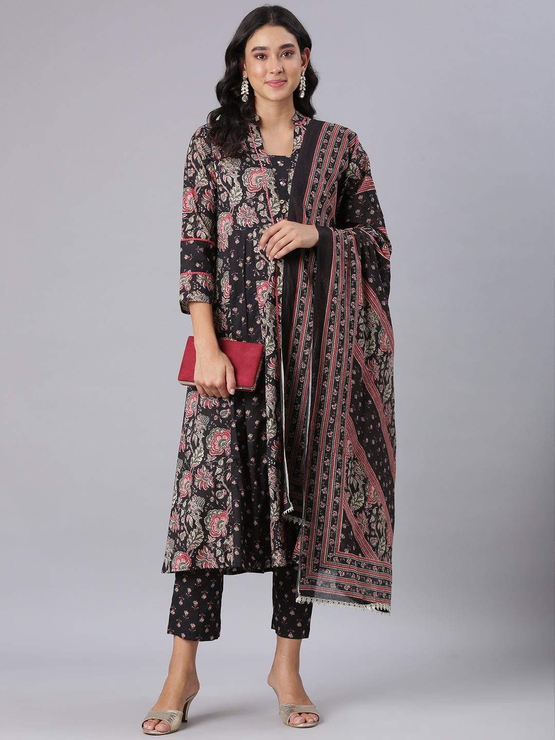 Neerus Black Printed Straight Kurta And Trousers With Dupatta