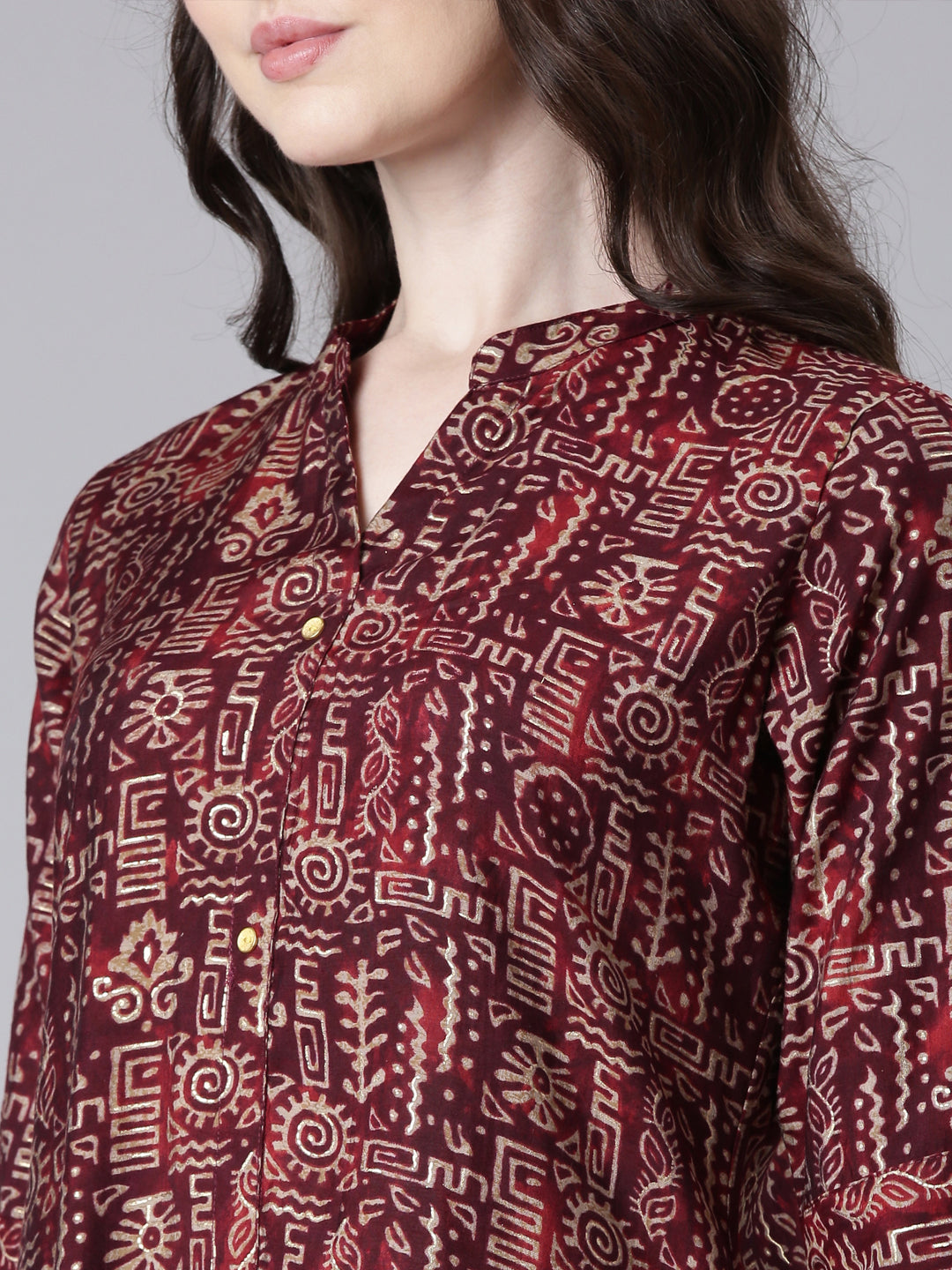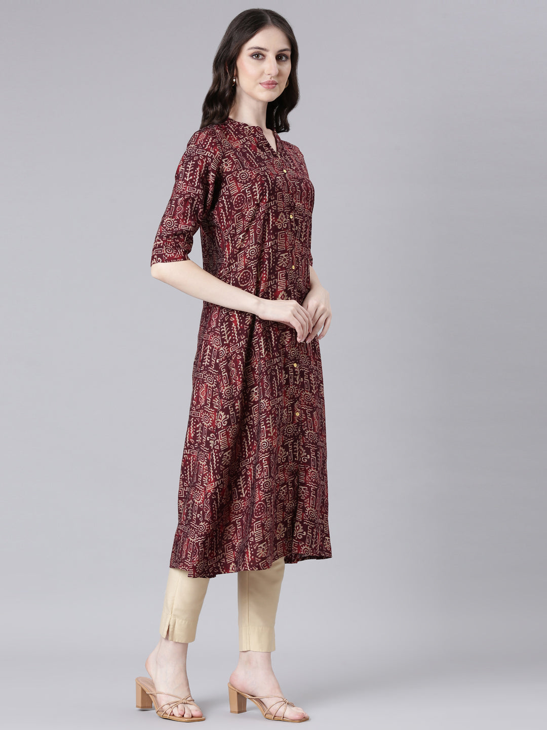 Step out in style with our Neerus Maroon Casual Tribal Straight Kurtas. Made with high quality fabric, these kurtas feature a trendy tribal print, adding a unique touch to your wardrobe.