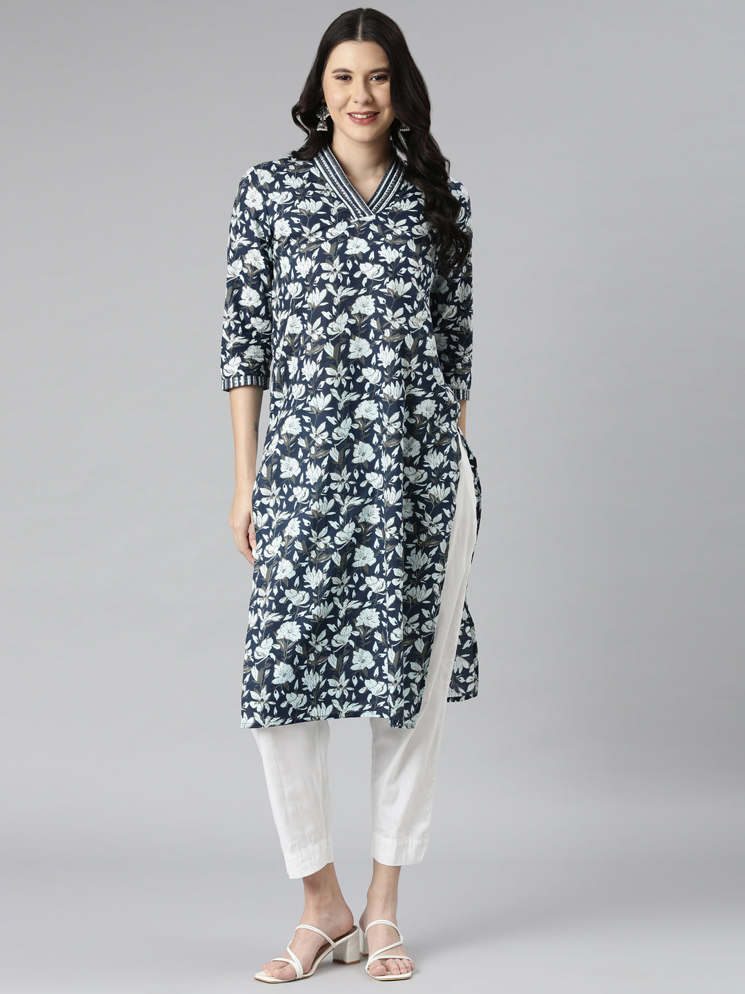 Neerus Navy Blue Casual Floral Straight Kurtas