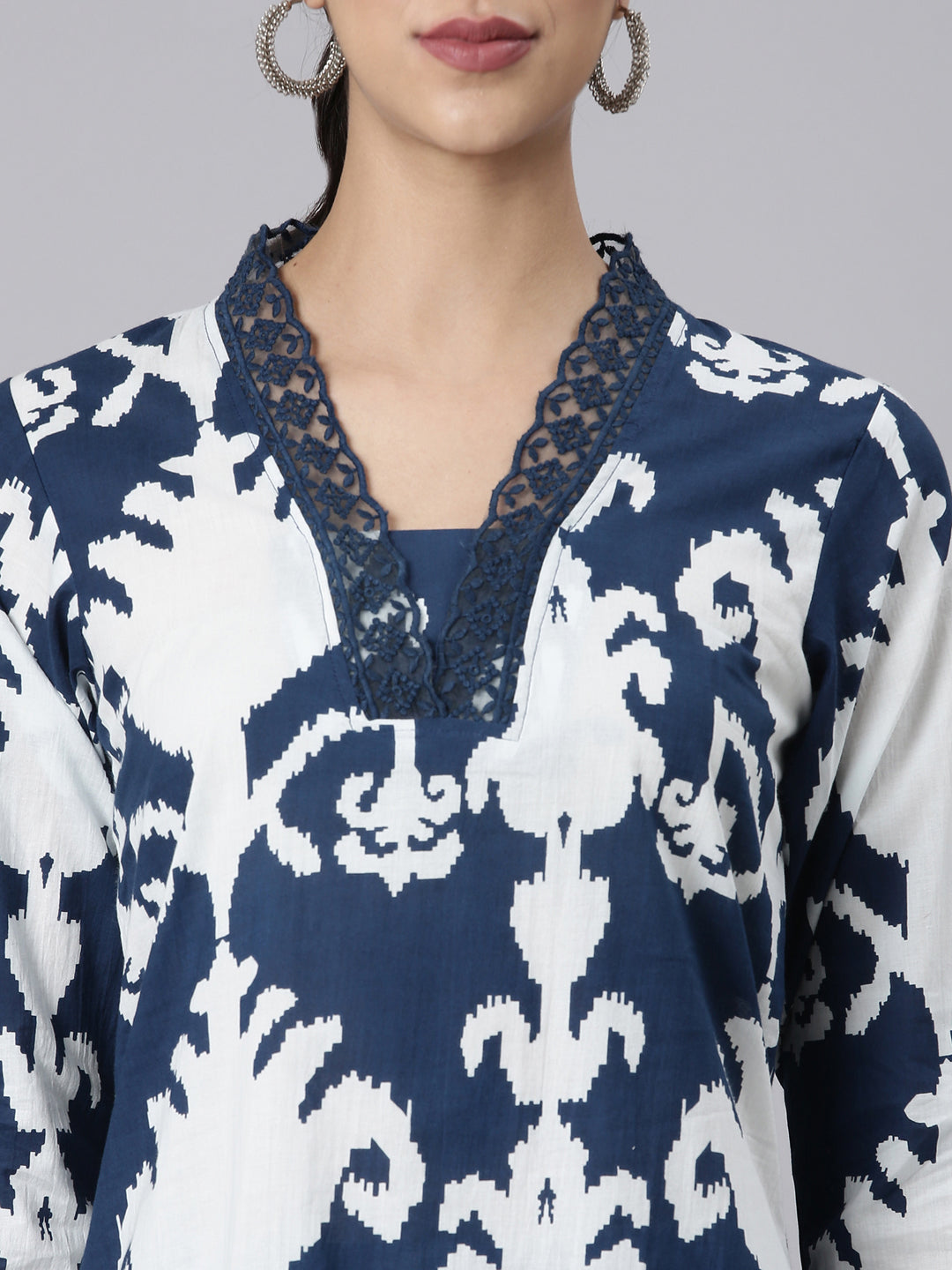 Elevate your ethnic wardrobe with the Neerus Navy Blue Printed Straight Kurta and Trousers. The elegant navy blue color and intricate print make this set perfect for any occasion. The straight fit and comfortable fabric ensure a flattering and effortless look for the customer.