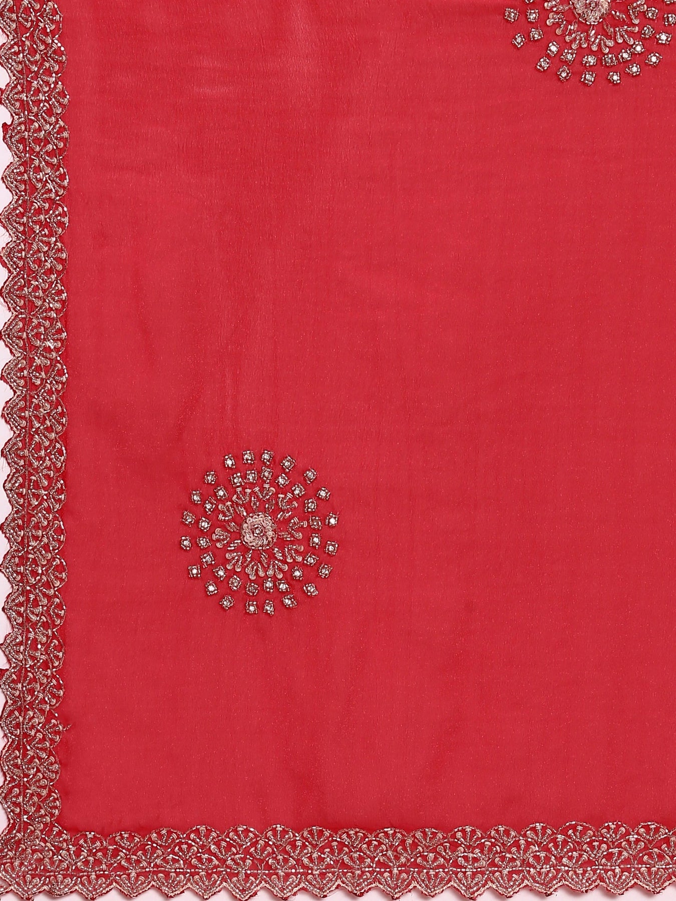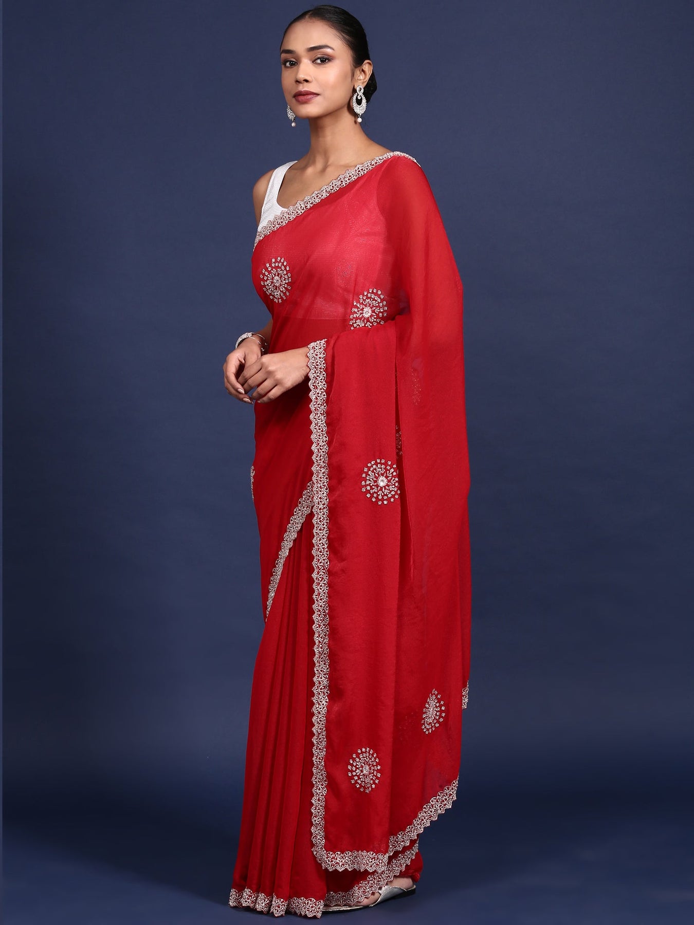 Drape yourself in timeless elegance with this stunning red satin saree, adorned with intricate aari embroidery. The luxurious satin fabric offers a graceful drape and lustrous finish, while the delicate hand-embroidered details add sophistication and charm. Perfect for weddings, festivals, and special occasions, this saree celebrates traditional craftsmanship with contemporary appeal. The rich red hue complements all skin tones, making it a versatile choice for your ethnic wardrobe. Wear it with confidence and grace.