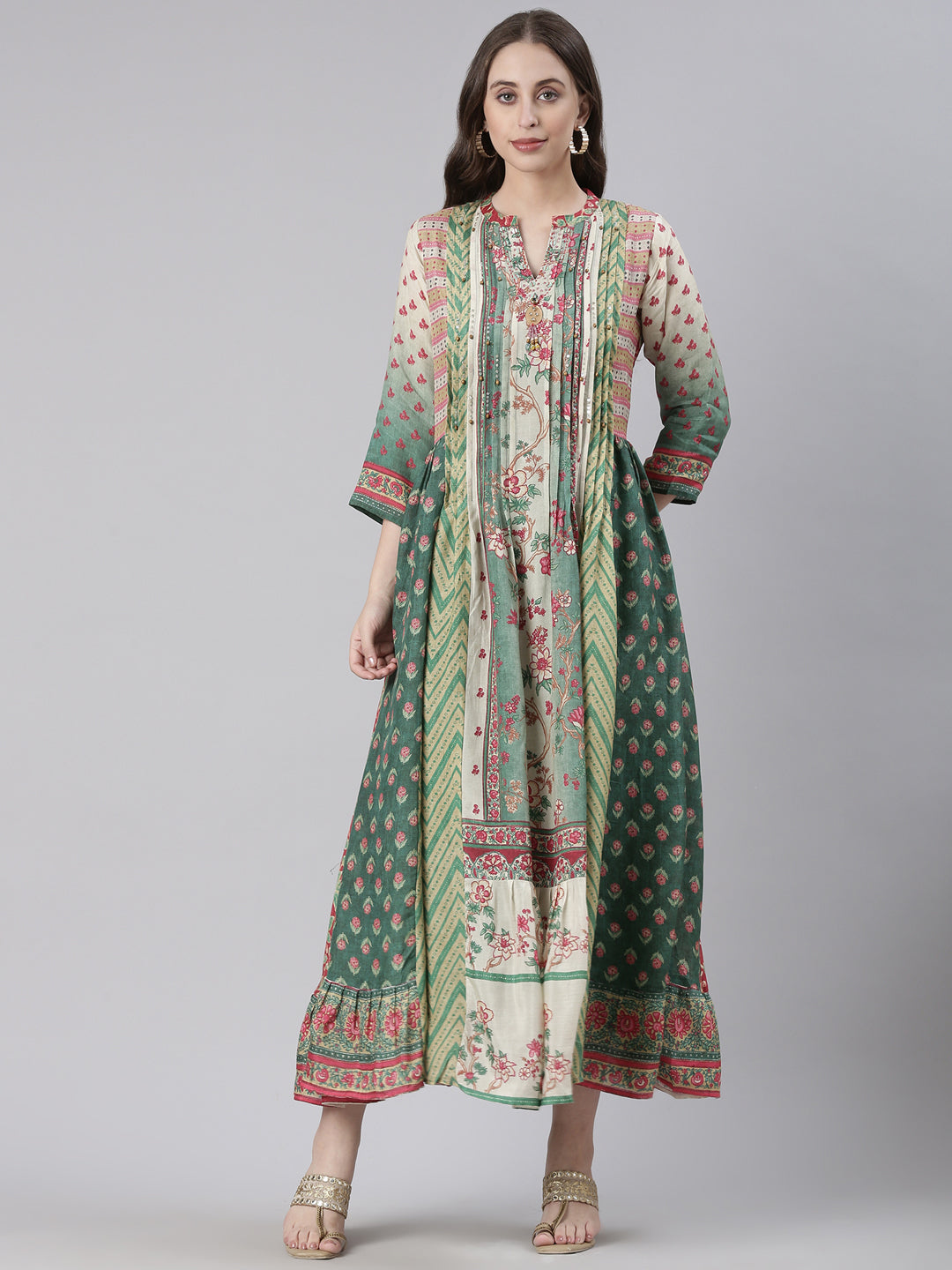 Embrace effortless style with the Neerus Green Casual Floral Maxi Dress. Its flowing silhouette and vibrant floral pattern make it perfect for casual outings or relaxed gatherings. Crafted for comfort, this dress allows you to move freely while adding a fresh, natural touch to your wardrobe.