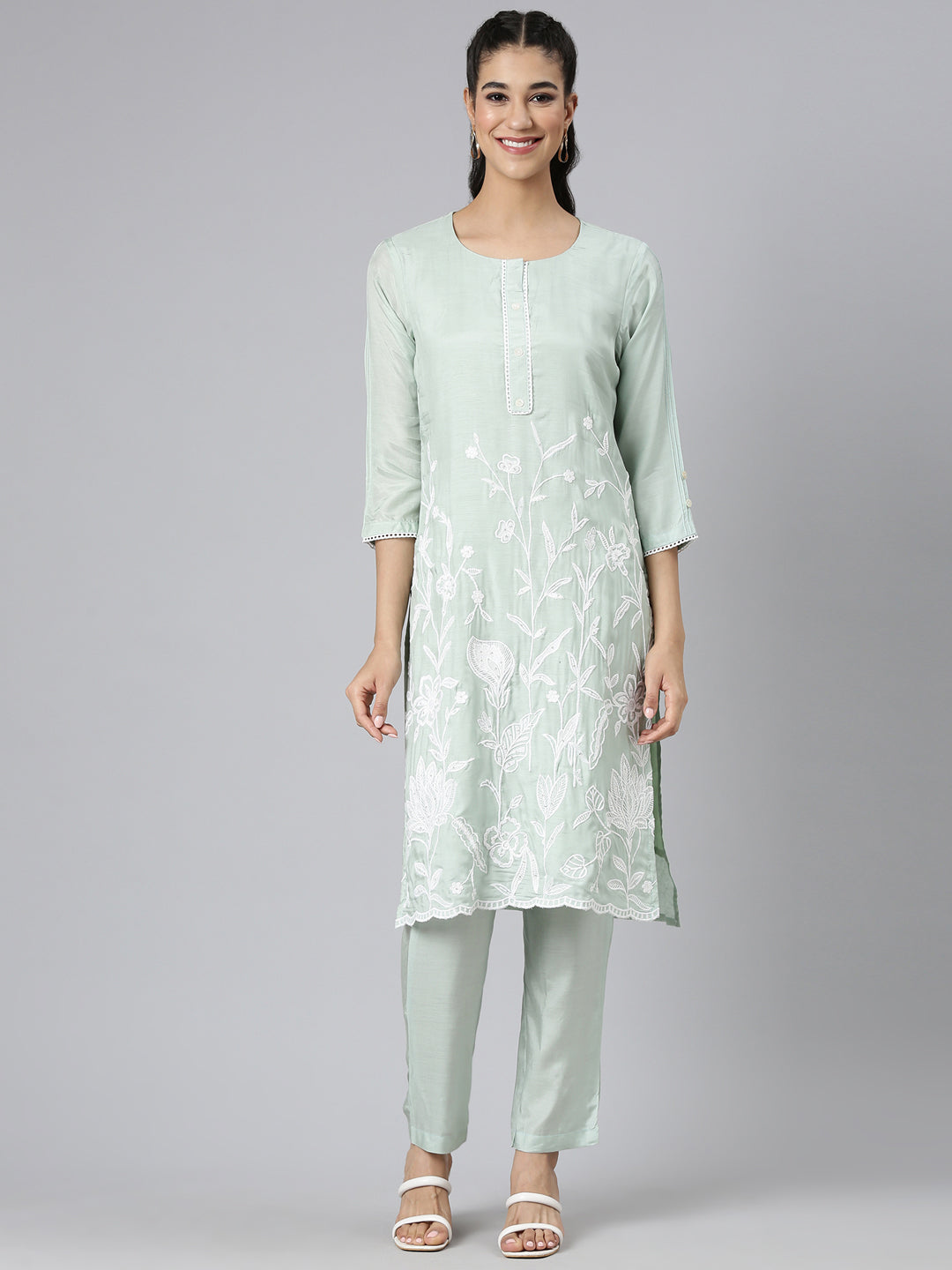 Neerus Green Casual Solid Straight Kurta and Trousers