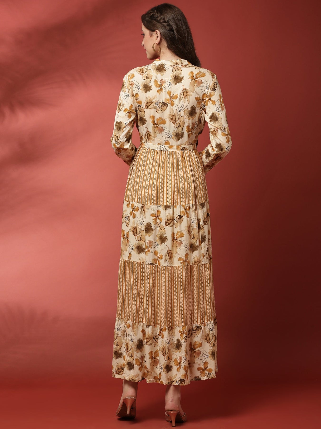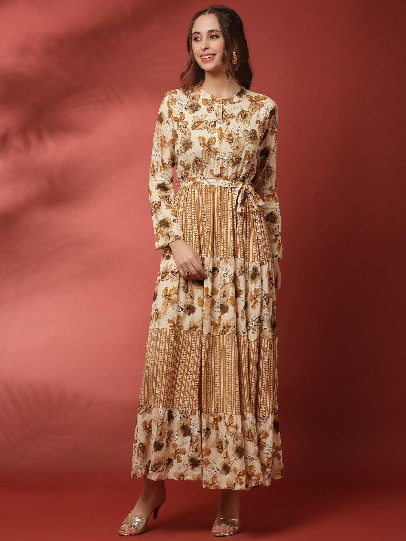 This beige rayon long dress features intricate hand embroidery that adds a refined touch to its printed design. Crafted from breathable rayon fabric, it ensures comfort and drapes elegantly for a flattering silhouette. Ideal for occasions that call for understated sophistication, this dress combines artisanal craftsmanship with everyday wearability.
