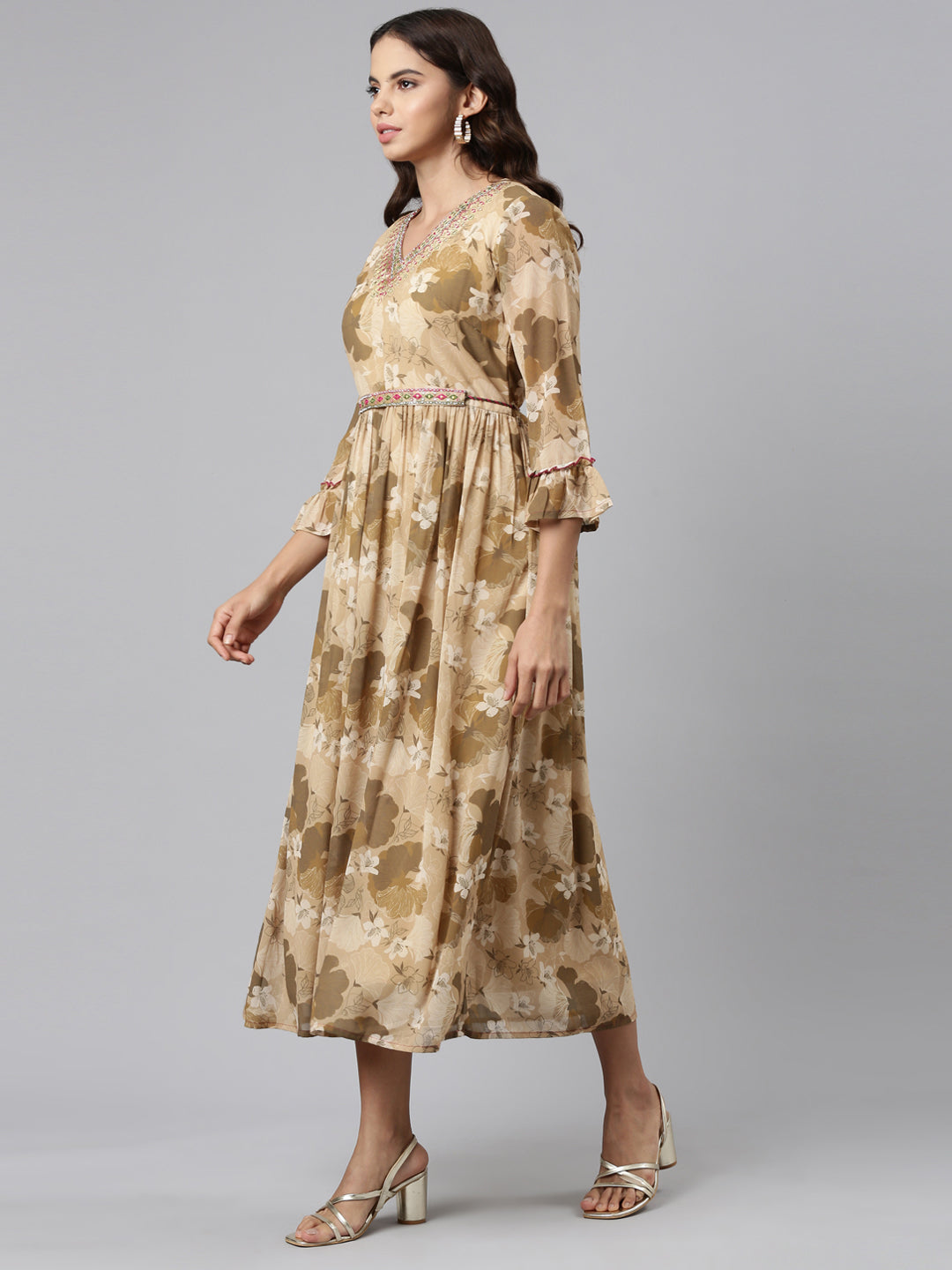 Neerus Beige Straight Casual Printed Maxi Dresses