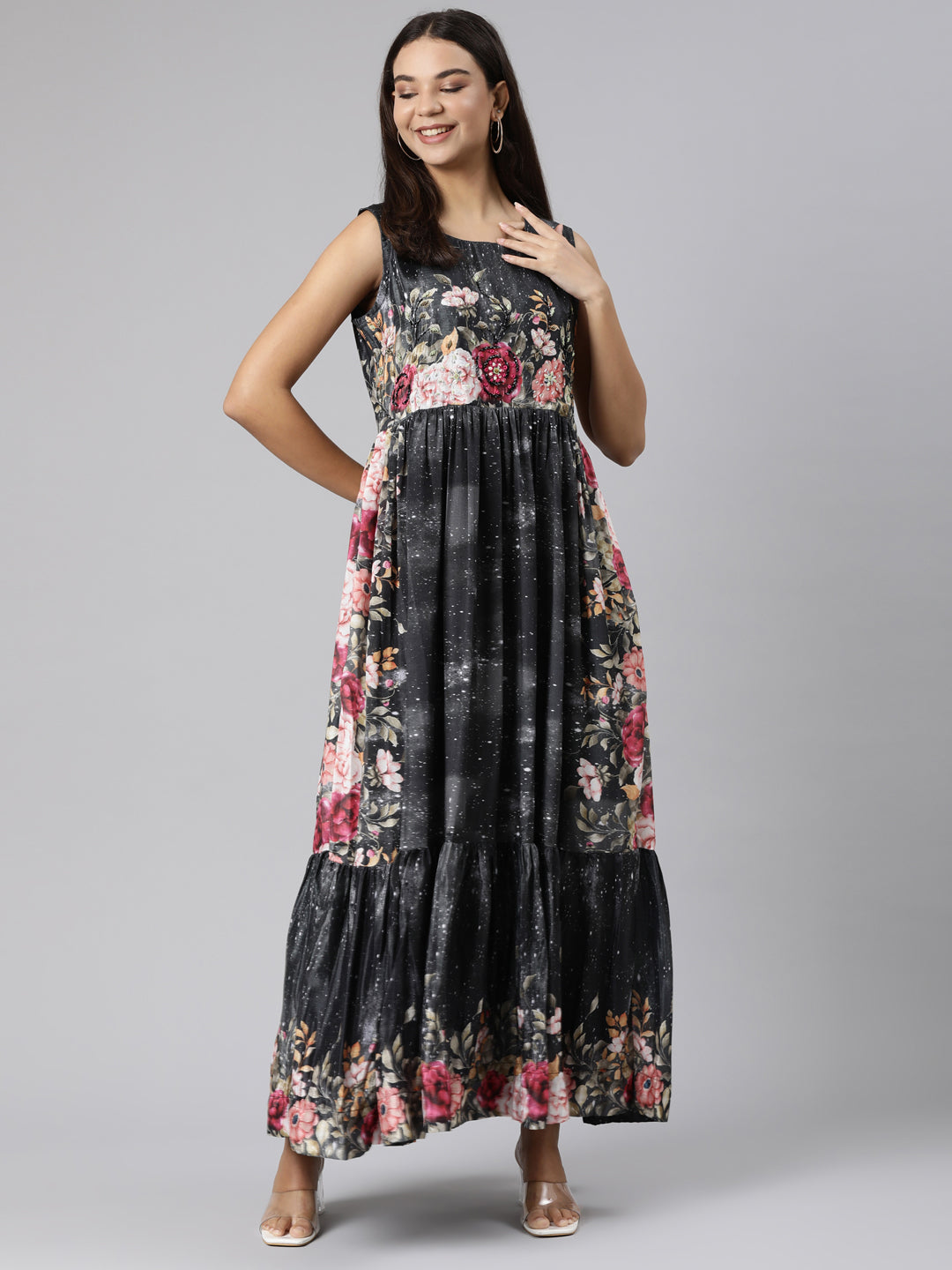 Neeru's Flared Floral Dresses In Black - Perfect For Any Casual Occasion.