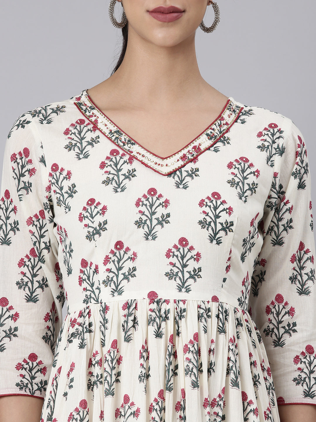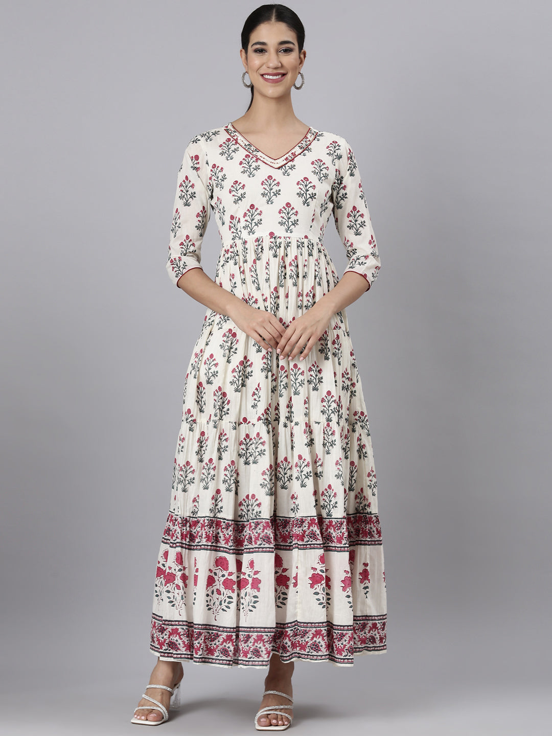 Discover effortless style and comfort with Neerus Off White Casual Maxi Floral Dresses. Made with high-quality fabric, these dresses offer a perfect fit and luxurious feel. Its vibrant floral design adds a touch of femininity to any occasion. Elevate your wardrobe with these trendy and versatile dresses.