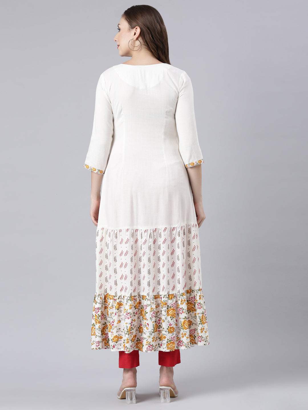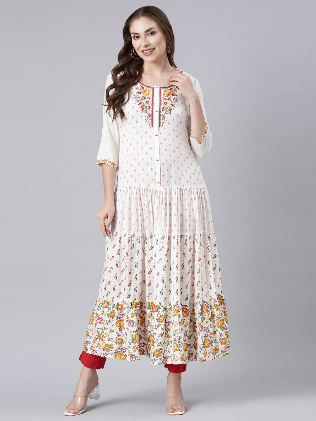 Elevate your casual style with Neerus Off White Flared Maxi Dress. The solid color adds versatility while the flared design offers a comfortable and flattering fit. Perfect for any occasion, step out in style with this effortless and chic dress.