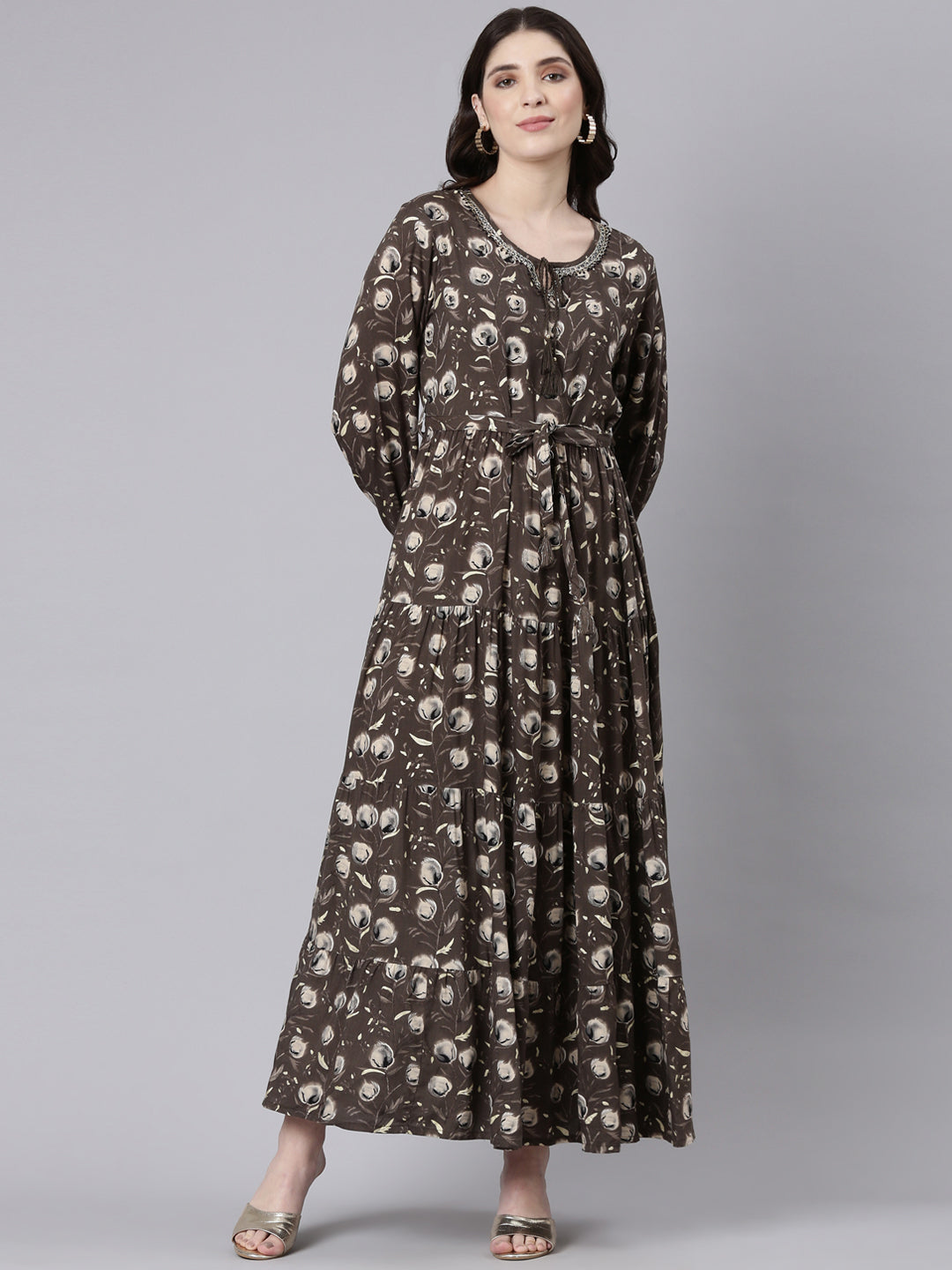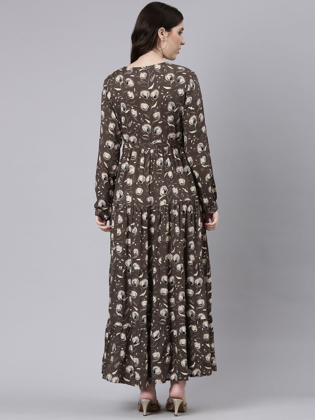 Neerus Olive Flared Casual Printed Fit And Flare Dresses