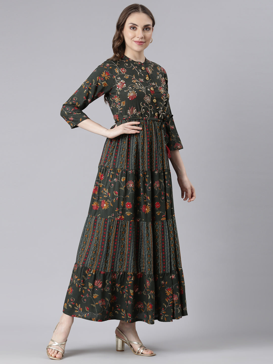 Neerus Olive Viscose Rayon Straight Casual Floral Maxi Dresses Elevate your everyday style with the effortless fluidity and charm of this maxi dress.