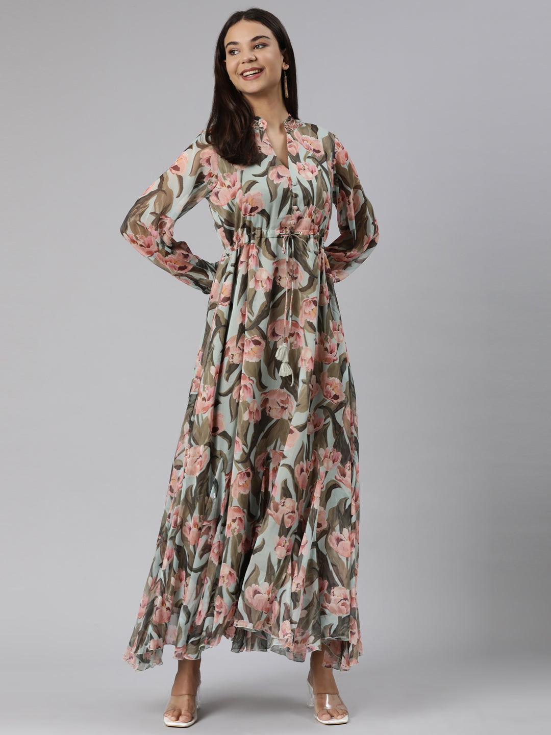 Elegant Neeru's Floral Dresses In Sea Green With Flared Design