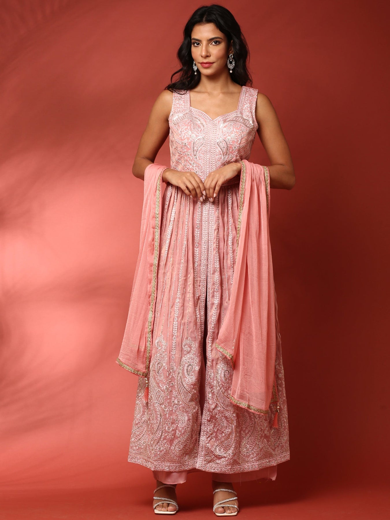 This pink thread work jacket three-piece suit set combines elegance with traditional craftsmanship. Featuring intricate threadwork on the jacket, paired with matching trousers and a coordinating vest, it offers a complete, polished look for special occasions. Designed to provide both style and comfort, this set helps you make a confident impression effortlessly.