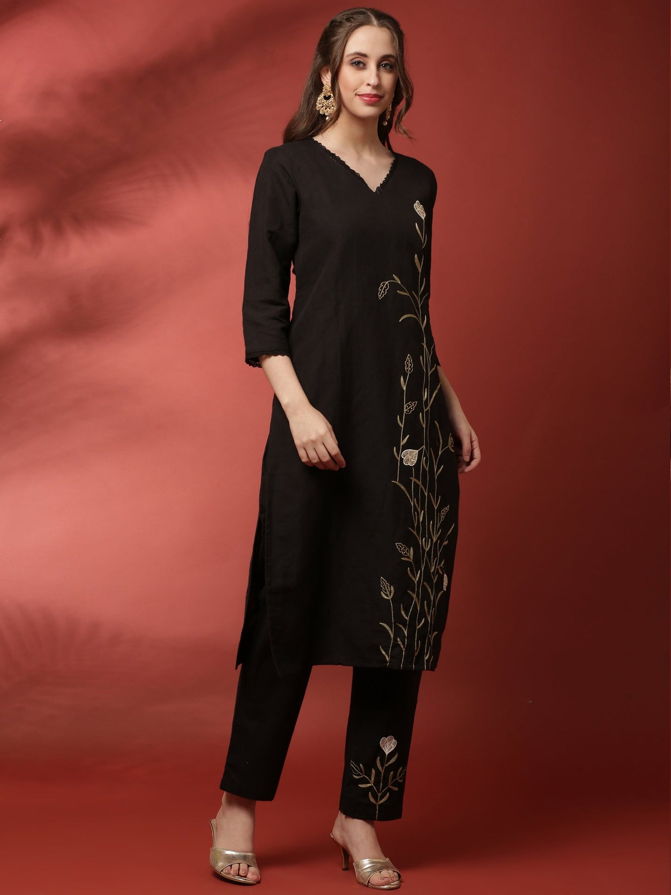 Elevate your wardrobe with this elegant black linen two-piece suit set, featuring intricate thread embroidery enhanced by subtle sequin accents. Perfect for both formal and festive occasions, it combines timeless craftsmanship with a modern touch, ensuring you stand out with understated sophistication and comfort.