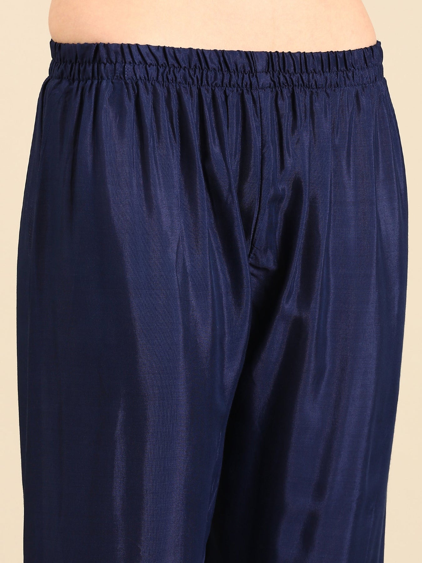 Experience elegance with this midnight blue georgette 3-piece suit set, featuring a timeless leheria print. The palm-shaped neckline is beautifully adorned with delicate beads and sequins, adding subtle shimmer to the sophisticated design. Crafted for comfort and style, this ensemble is perfect for graceful occasions where refinement matters.