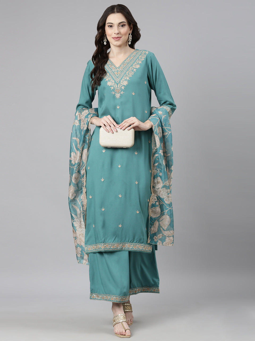 Neerus Green Casual Ethnic Motifs Straight Kurta and Palazzos With Dupatta