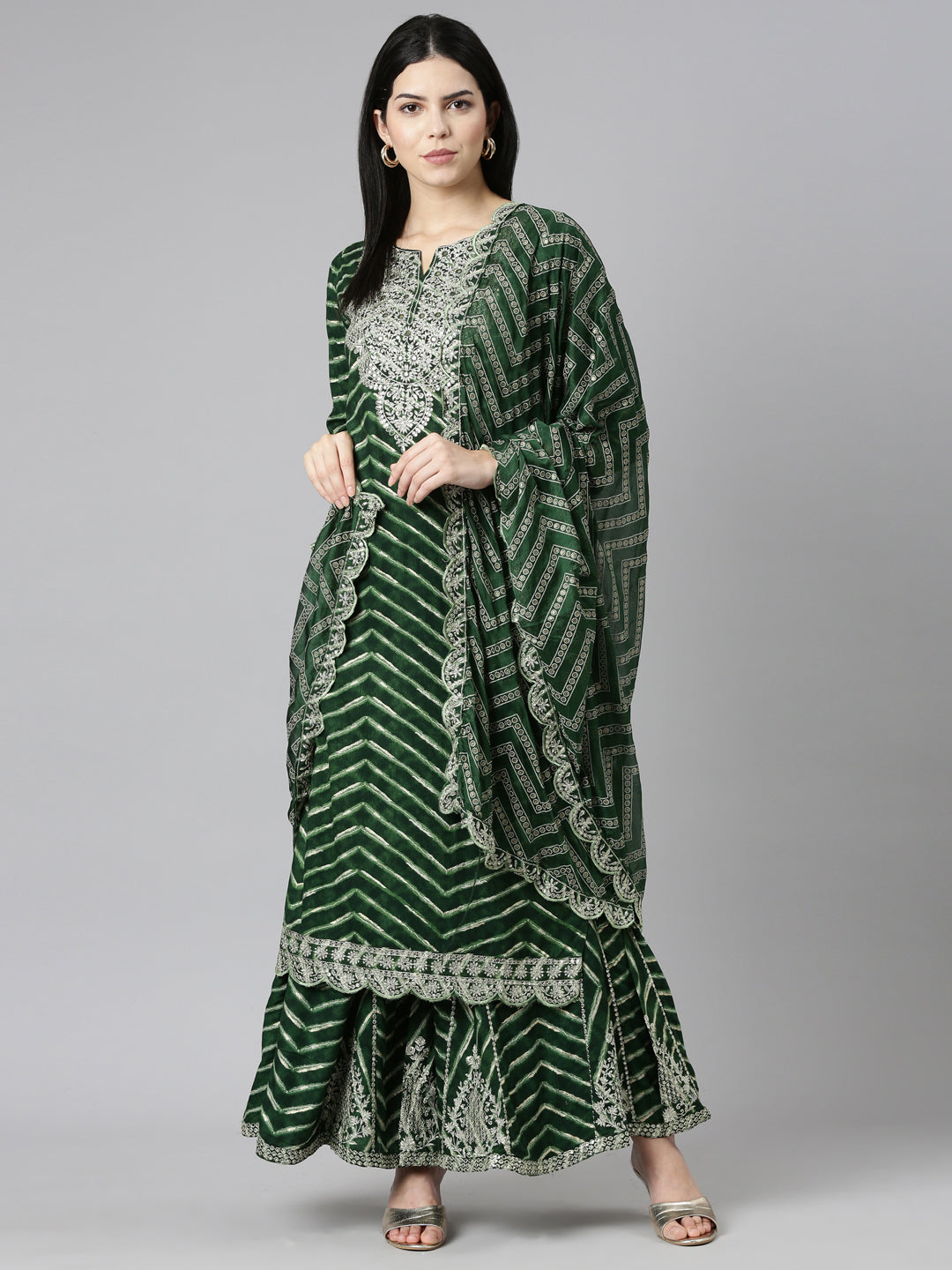 Neerus Green Regular Straight Printed Kurta And Sharara With Dupatta