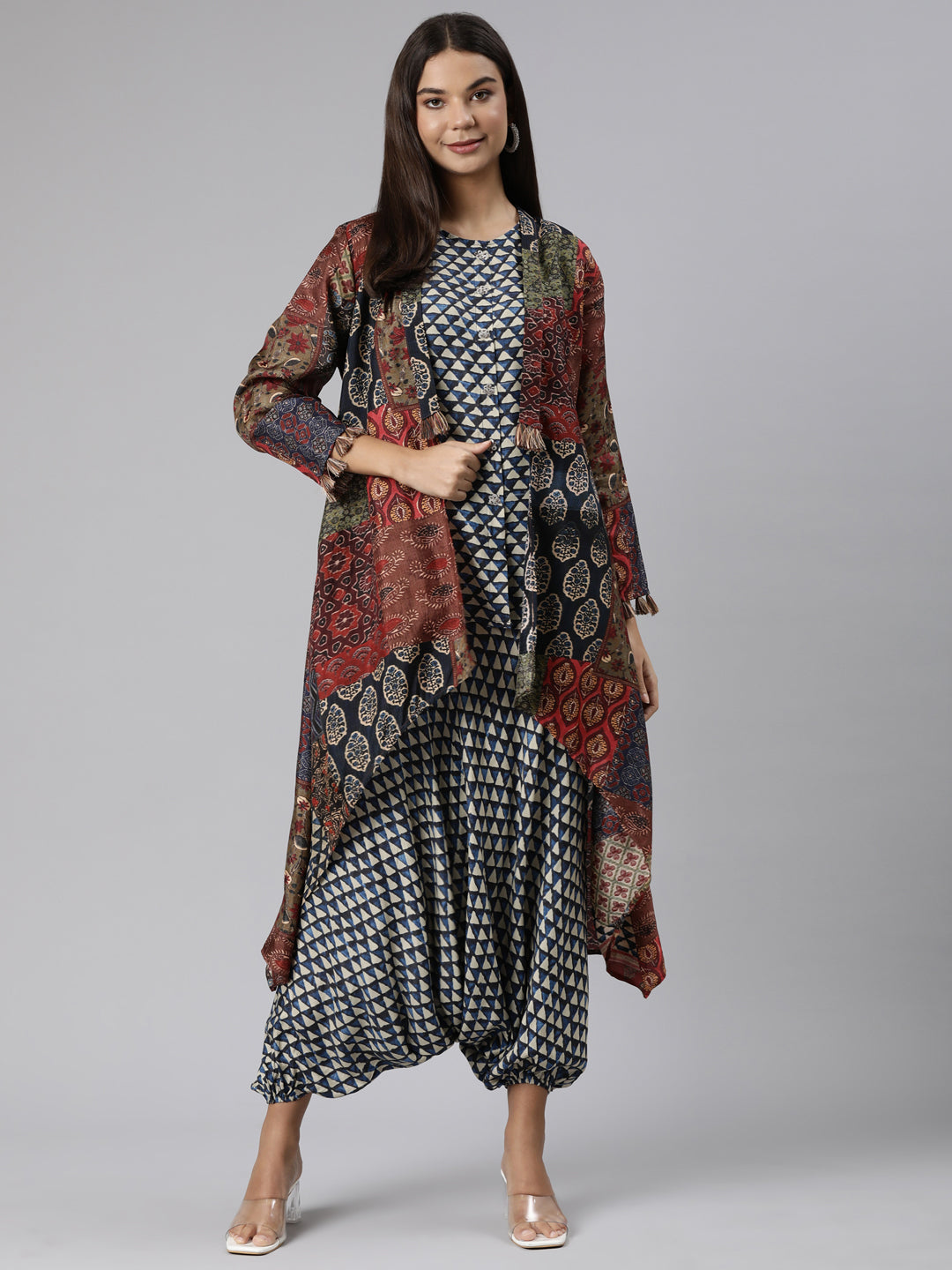 Neerus Multi Regular Straight Chevron Kurta And Veshti With Jacket