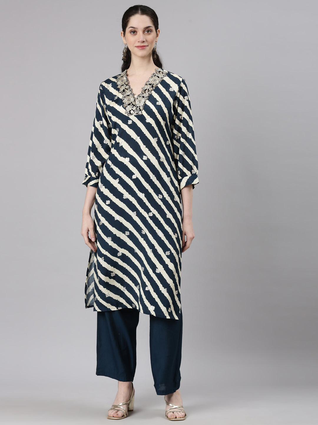 Neerus Navy Blue Straight Casual Leheriya Kurta and Palazzo