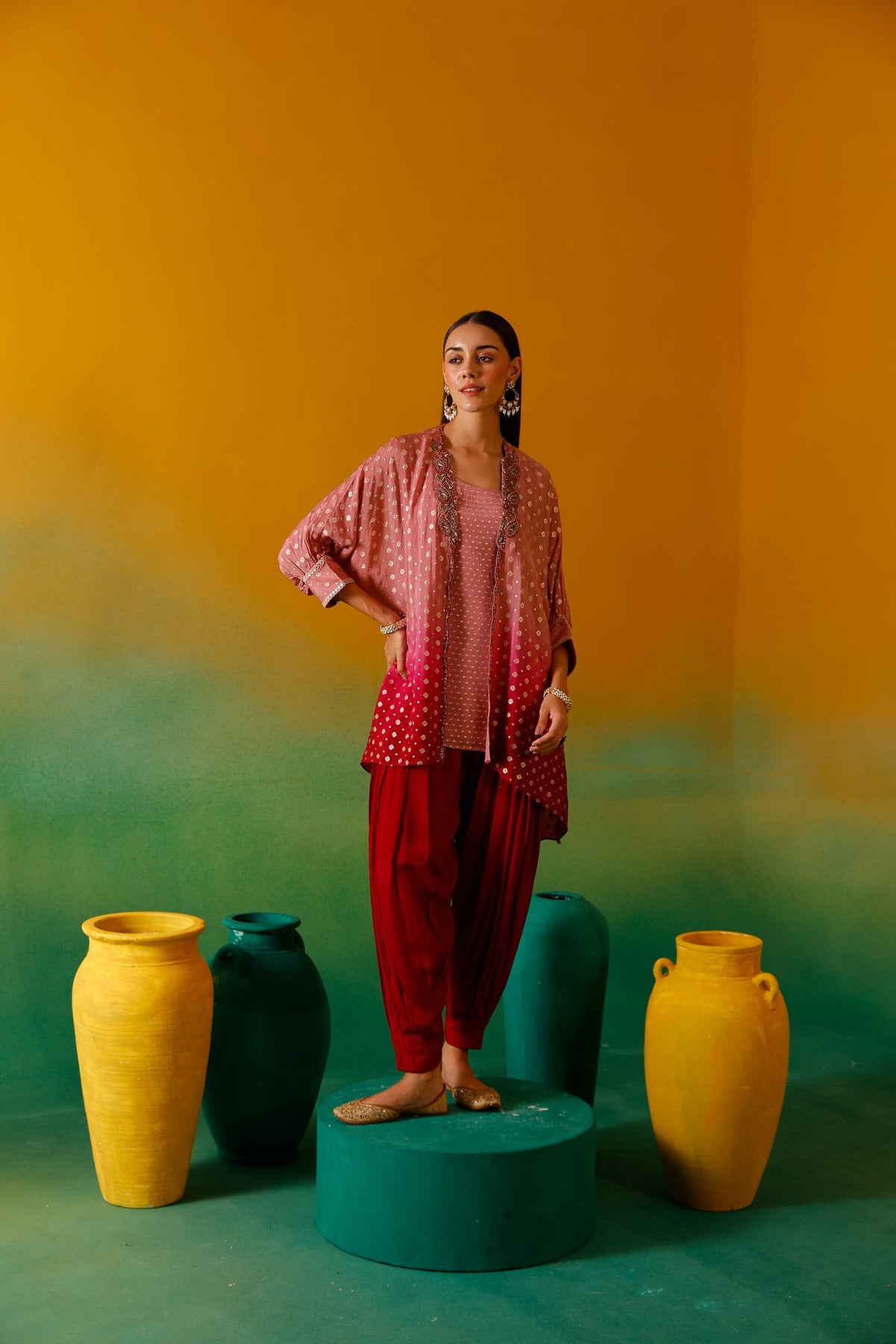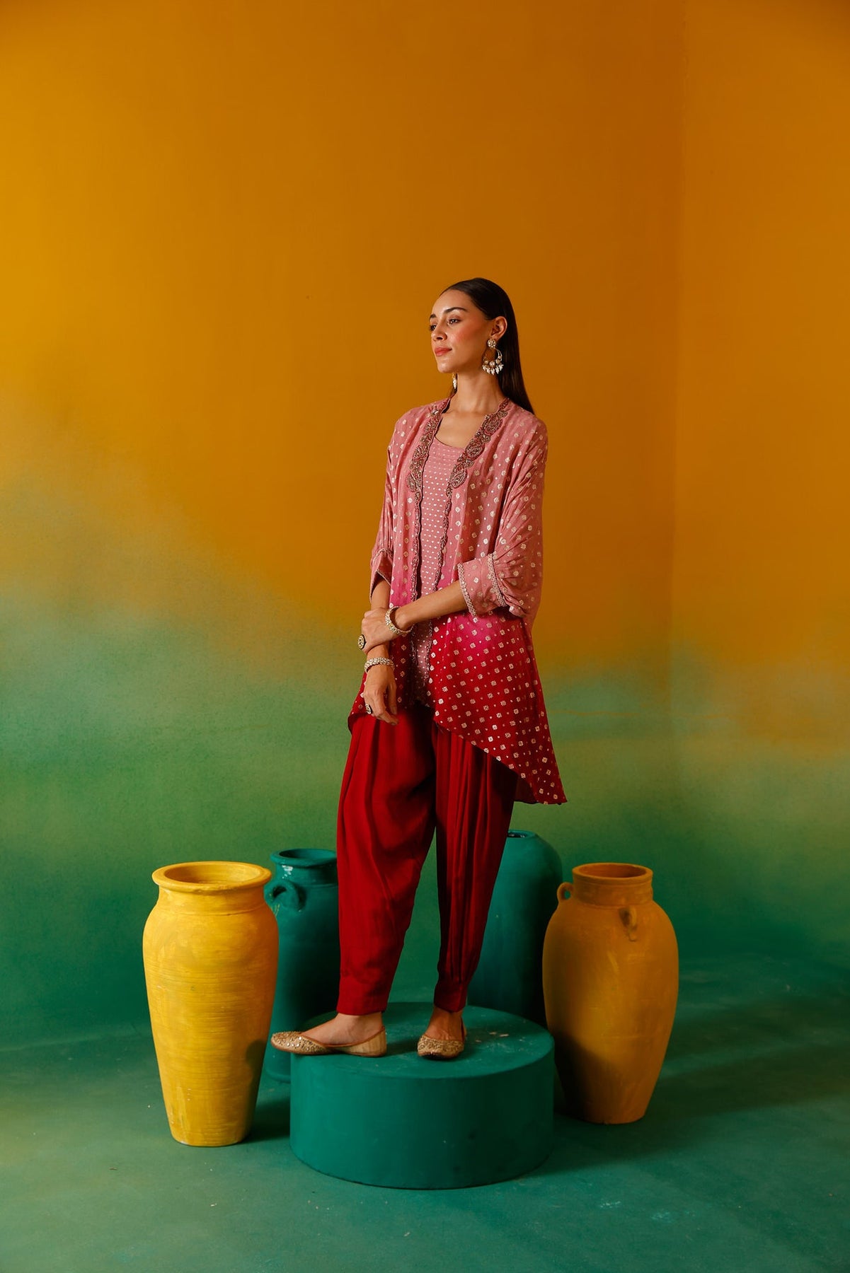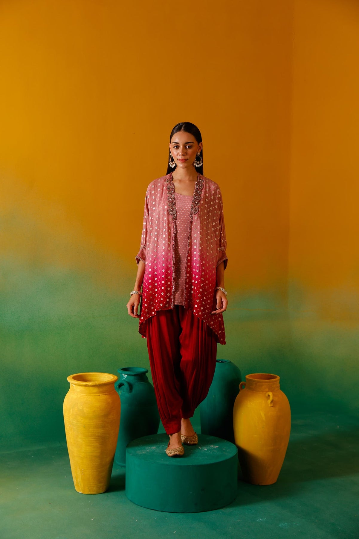 Elevate your wardrobe with this sophisticated Onion Beads and Stones Chinon Fabric Co-Ord Set. Meticulously crafted with premium chinon fabric, this ensemble features delicate onion bead embellishments and stone detailing for a luxurious finish. The lightweight, flowing material ensures comfort while maintaining an elegant silhouette, perfect for special occasions or formal gatherings.