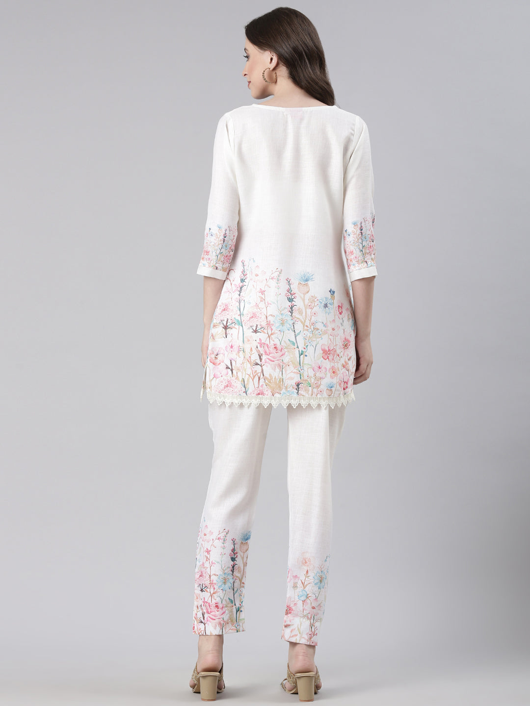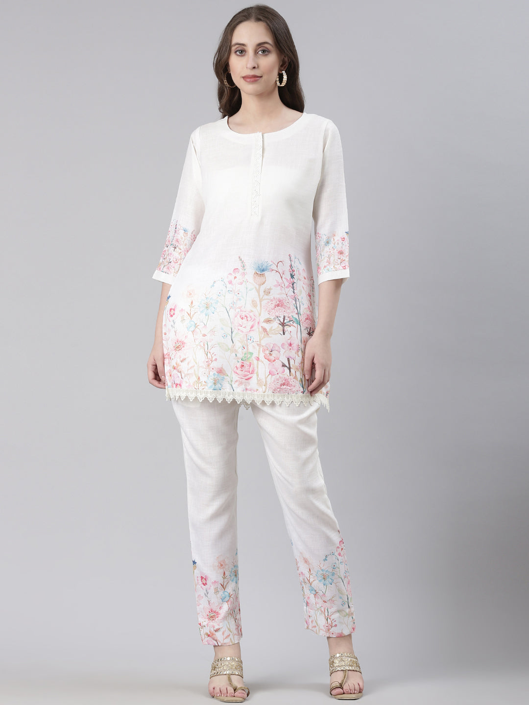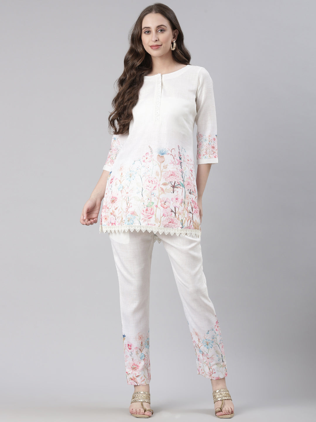 Neerus White Casual Printed Kurti with Trousers