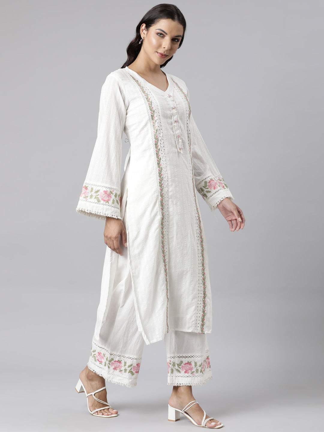 Neerus White Panelled Straight Yoke Design Kurta And Palazzos With Dupatta