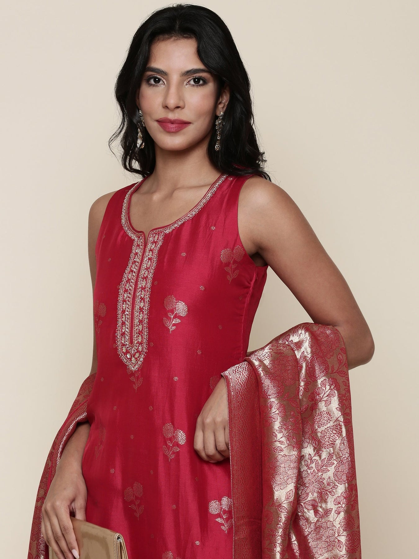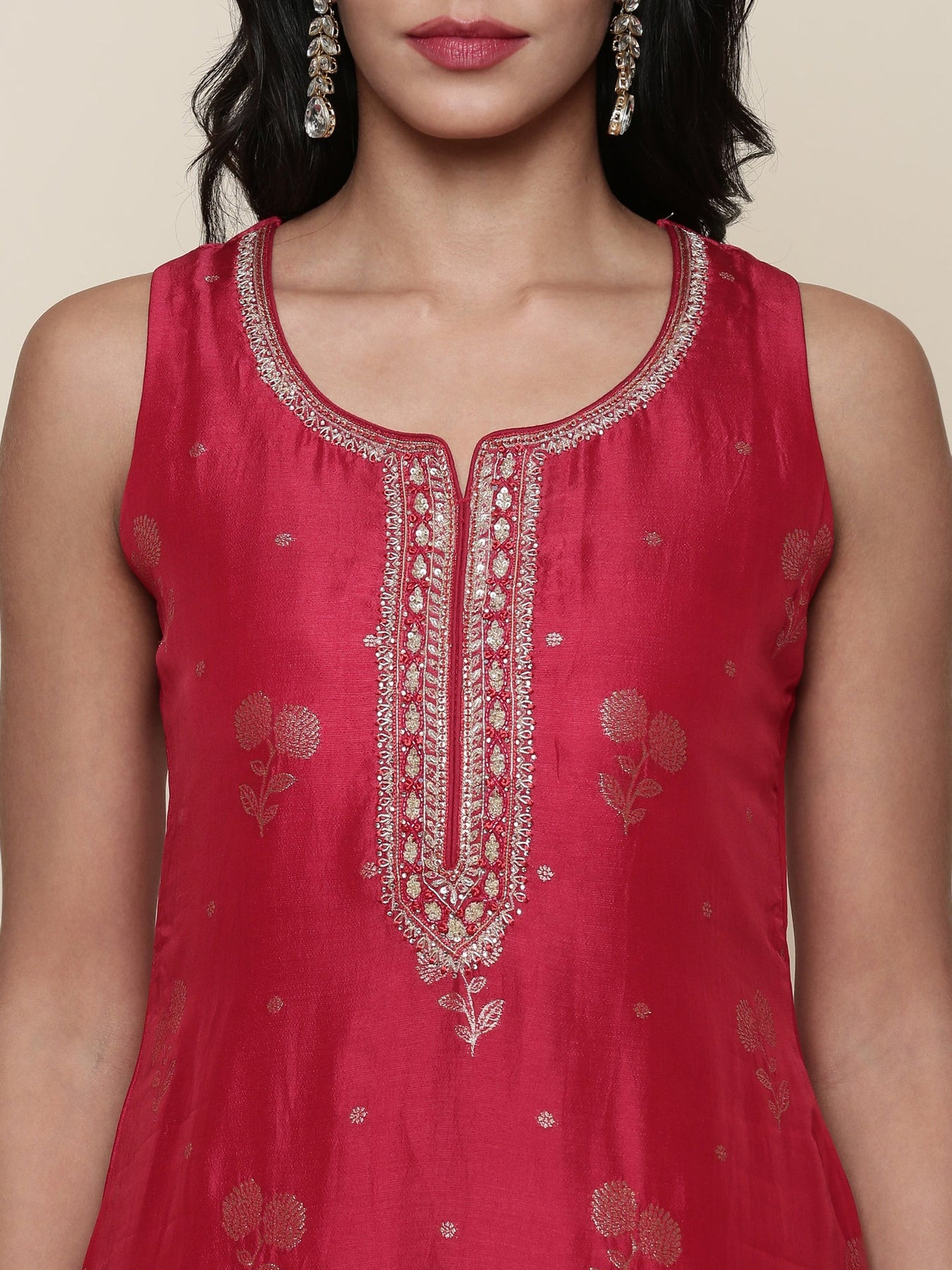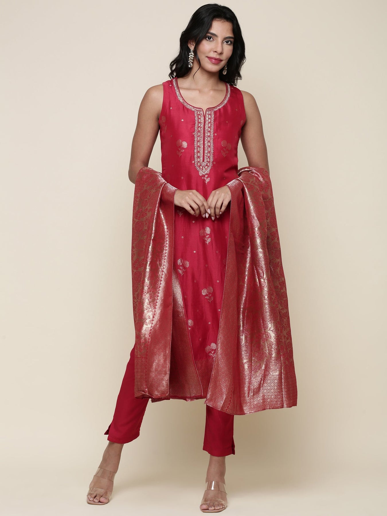 Experience elegance with this Silk red embroidered three-piece suit set. Crafted from smooth silk, the rich red fabric is adorned with intricate embroidery, enhancing its refined appeal. Perfectly tailored, this set offers a sophisticated silhouette suitable for formal occasions, combining traditional charm with modern style for a timeless look.