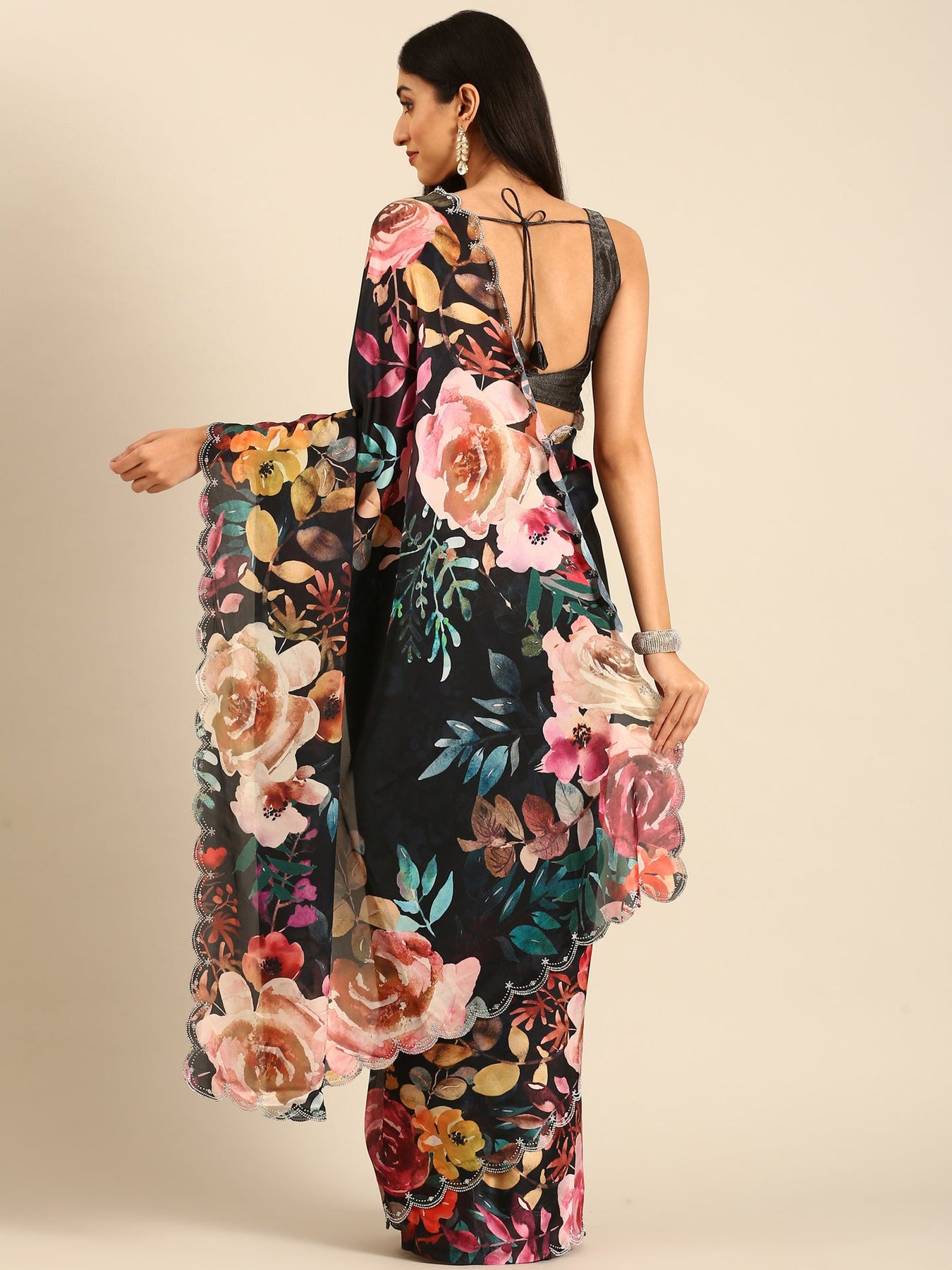 Elevate your elegance with this black satin floral printed saree, featuring intricate Swarovski embroidery that catches the light with every movement. The delicate floral design combined with sparkling details offers a refined and graceful look, perfect for special occasions. Crafted to enhance your sophistication, this saree blends traditional charm with modern glamour seamlessly.