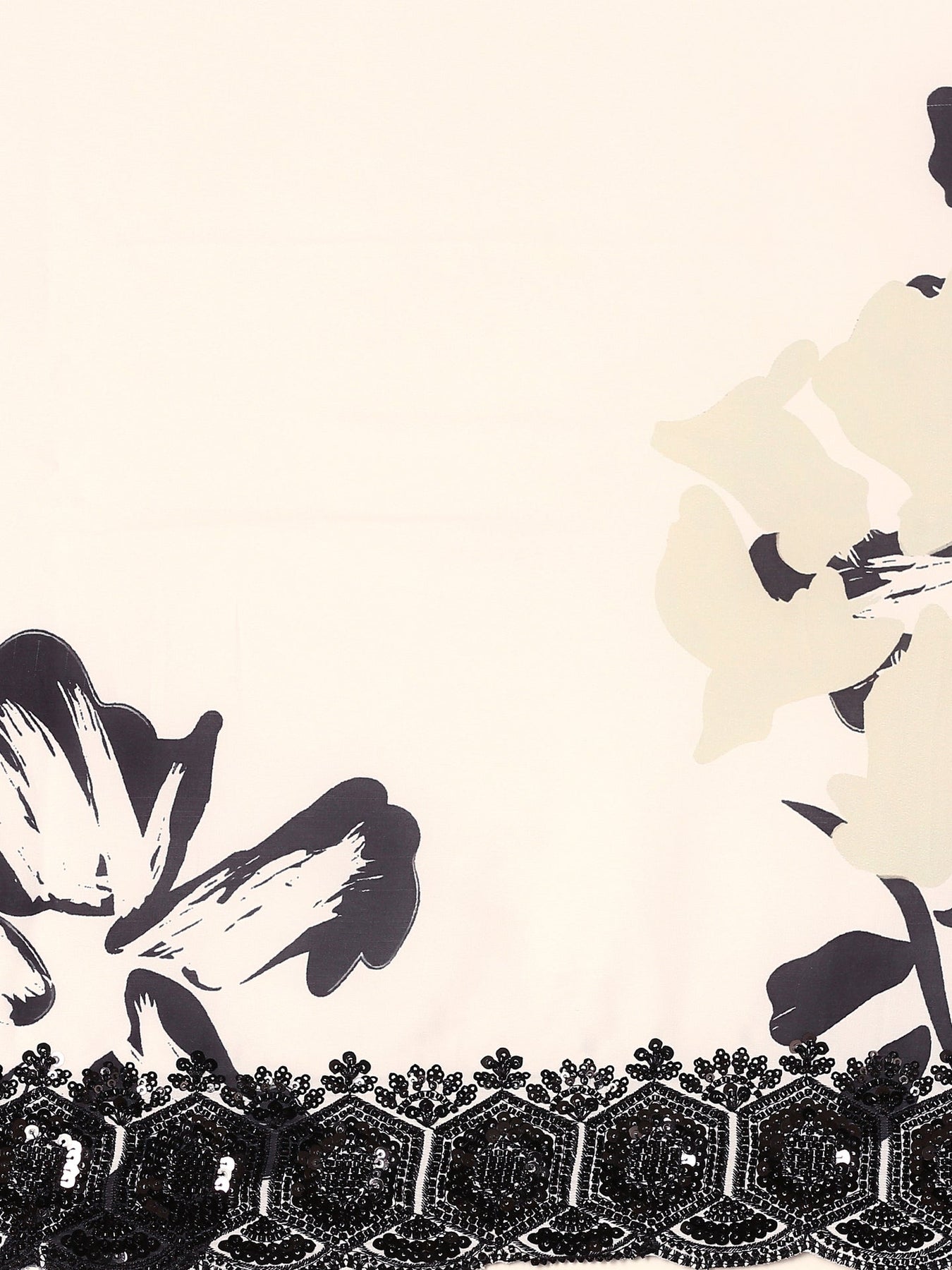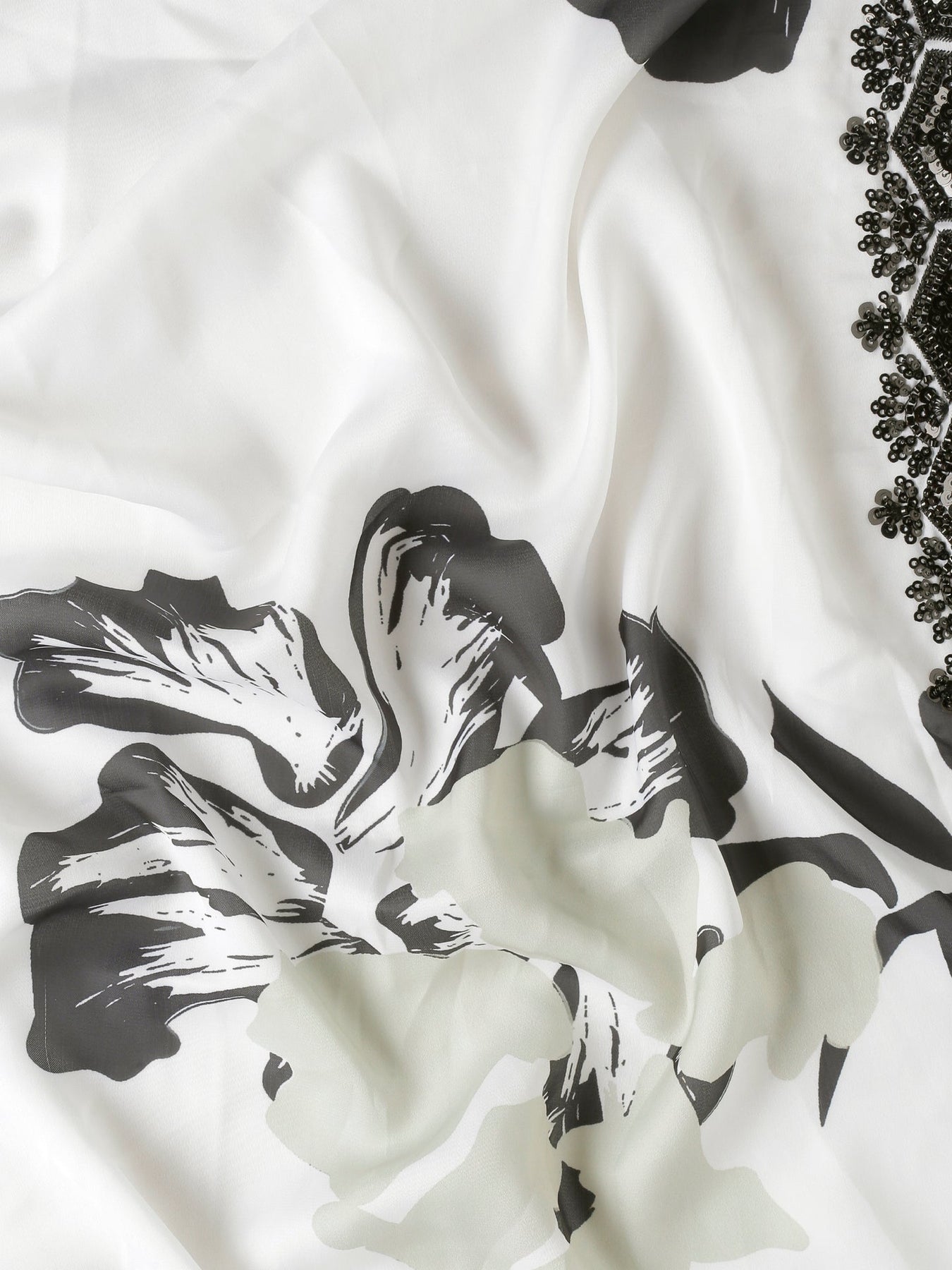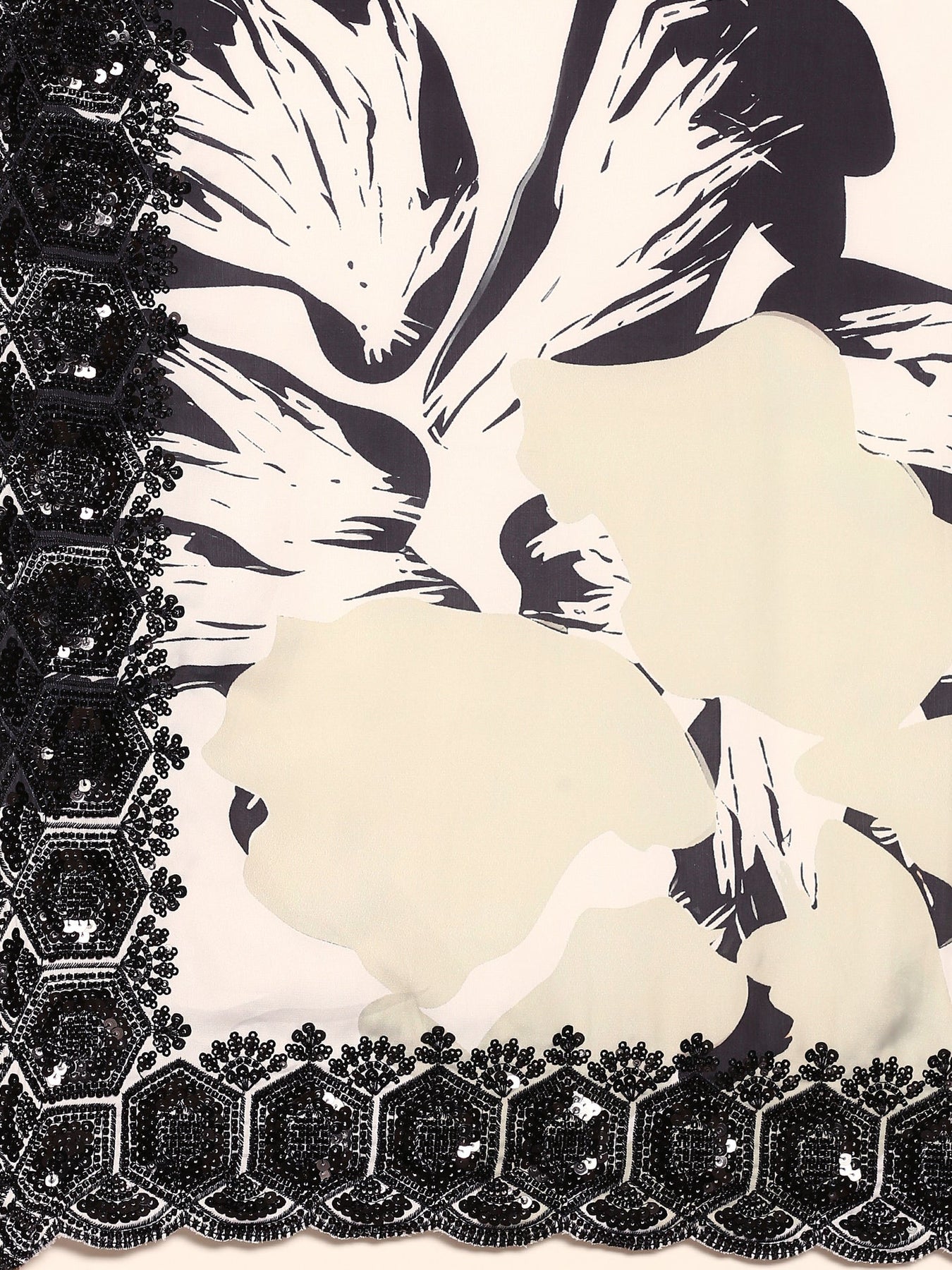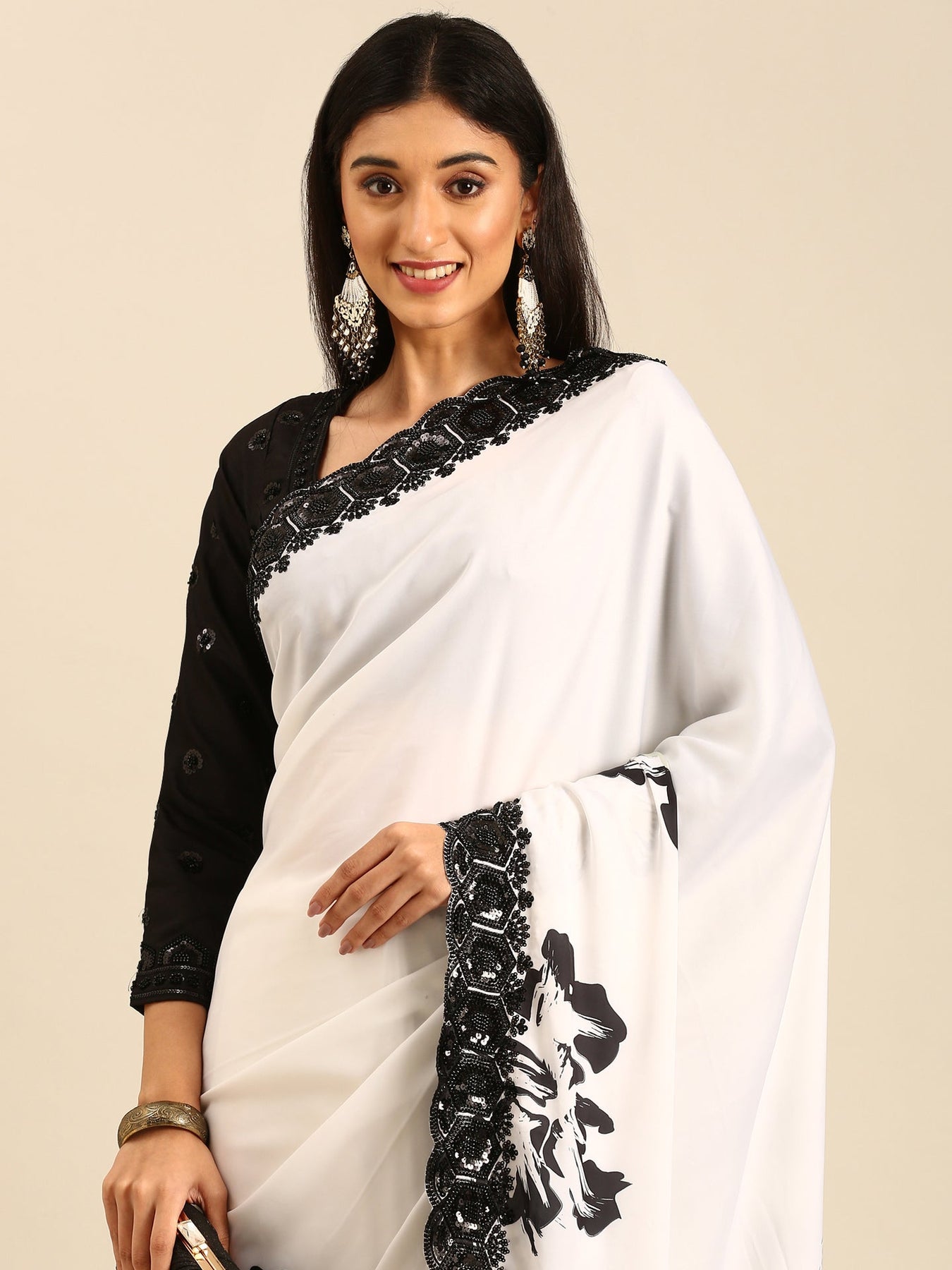 Black & White Satin Printed Saree With Hand Embroidery & Readymade Blouse