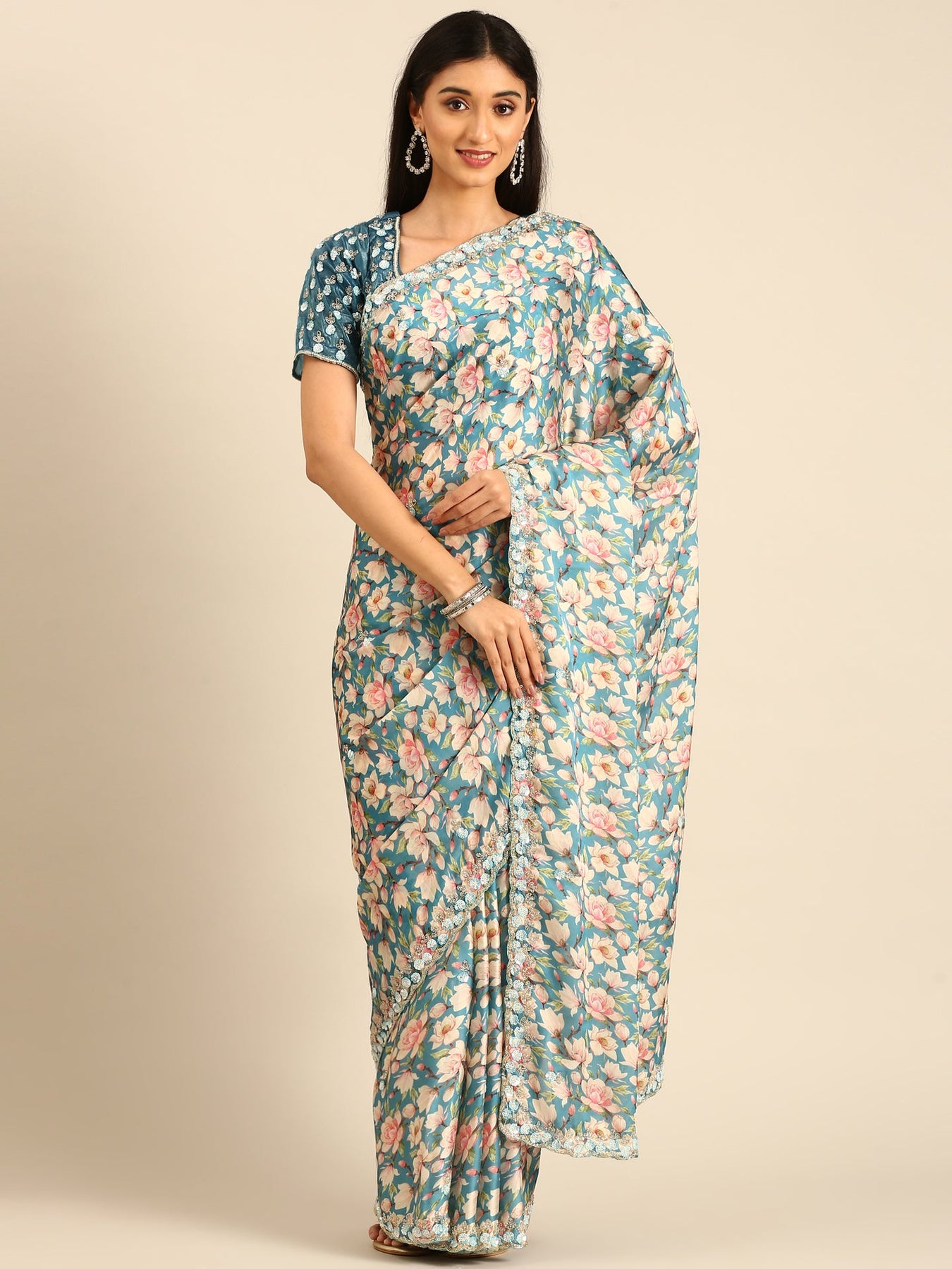 Experience the beauty and comfort of this blue floral printed satin saree, delicately adorned with pearls and sequins embroidery. It comes with a heavy ready-made blouse, making it easy to wear and perfect for any special occasion. The smooth satin fabric ensures a graceful drape, helping you look and feel your best.