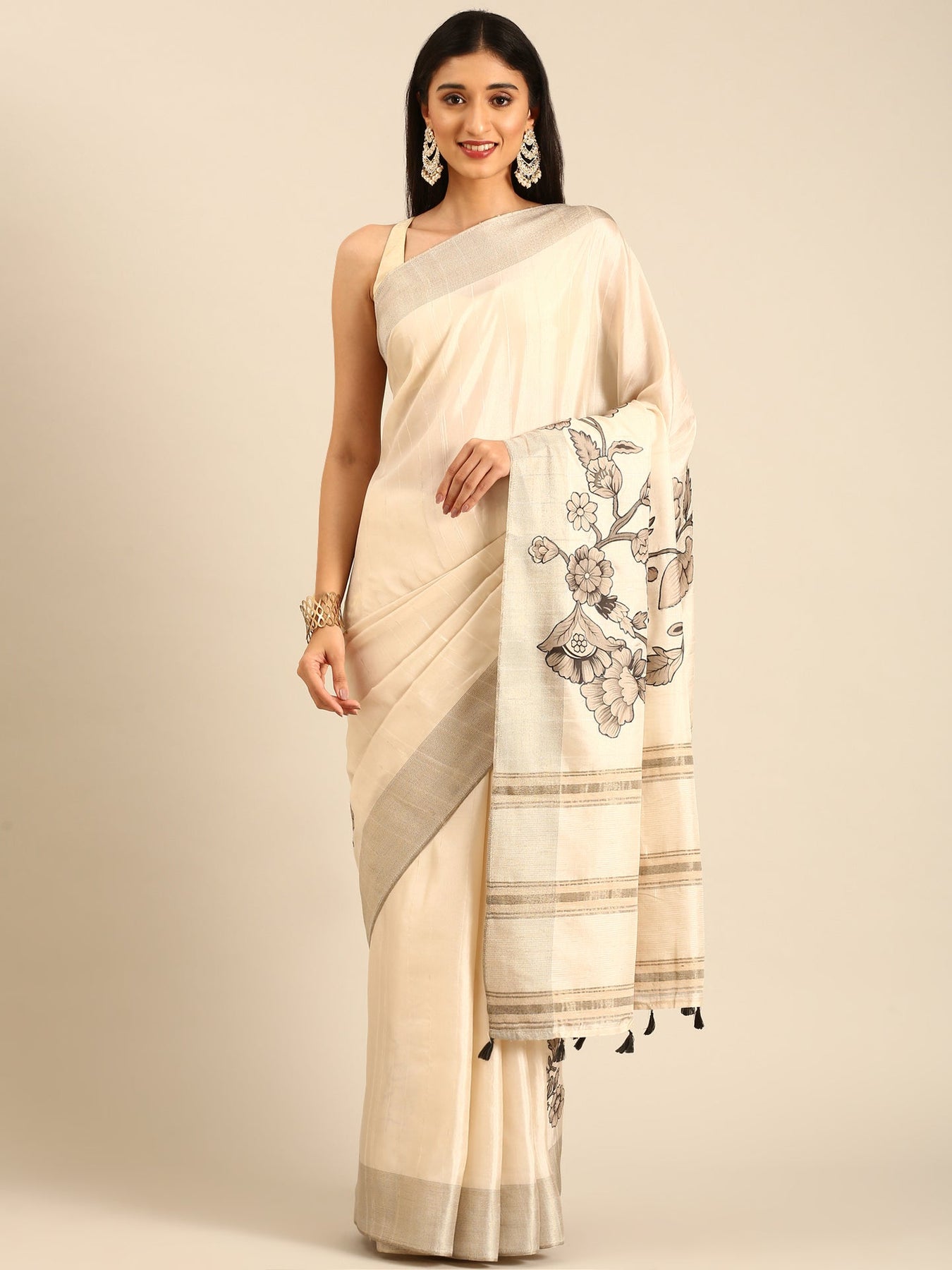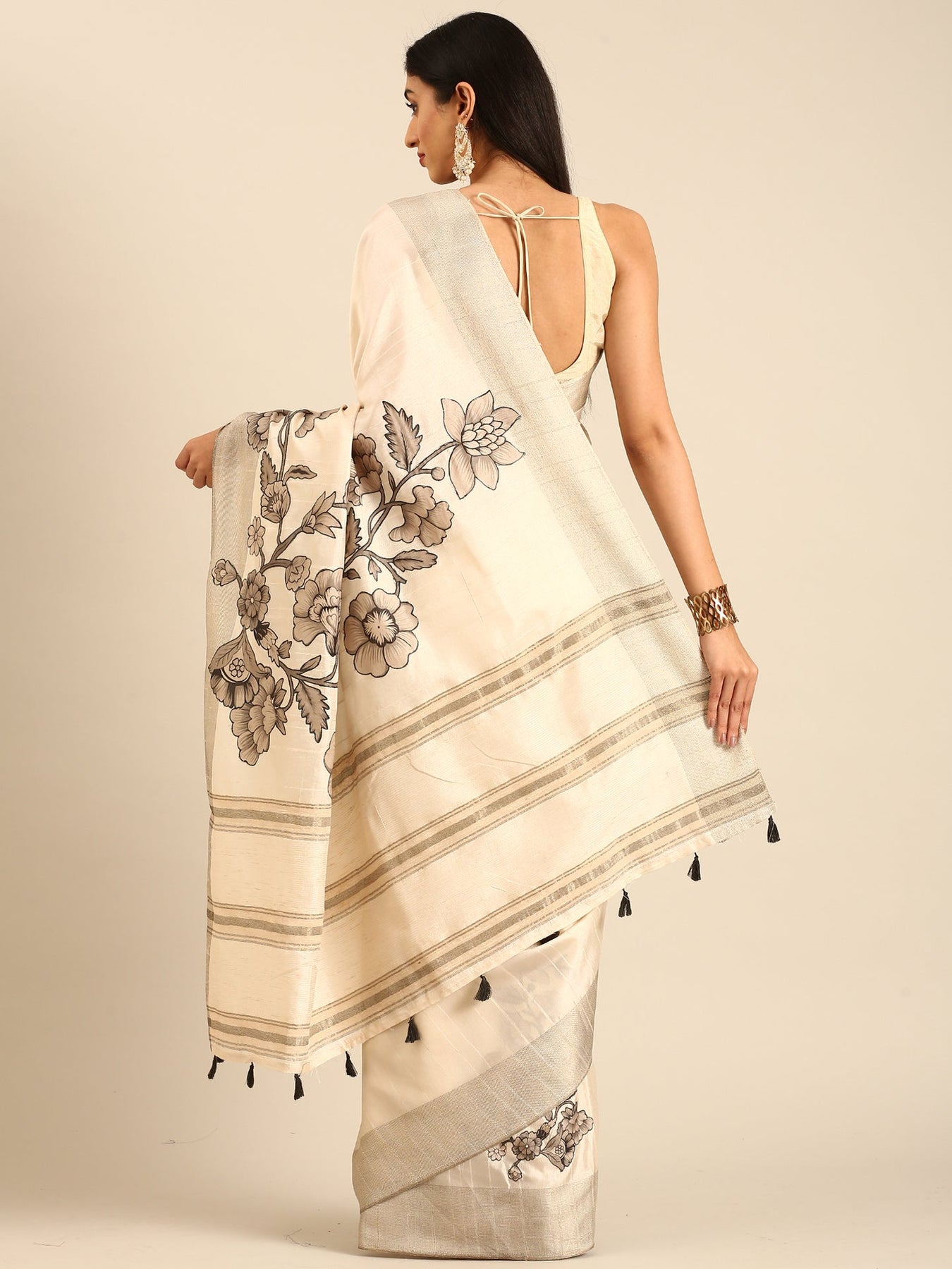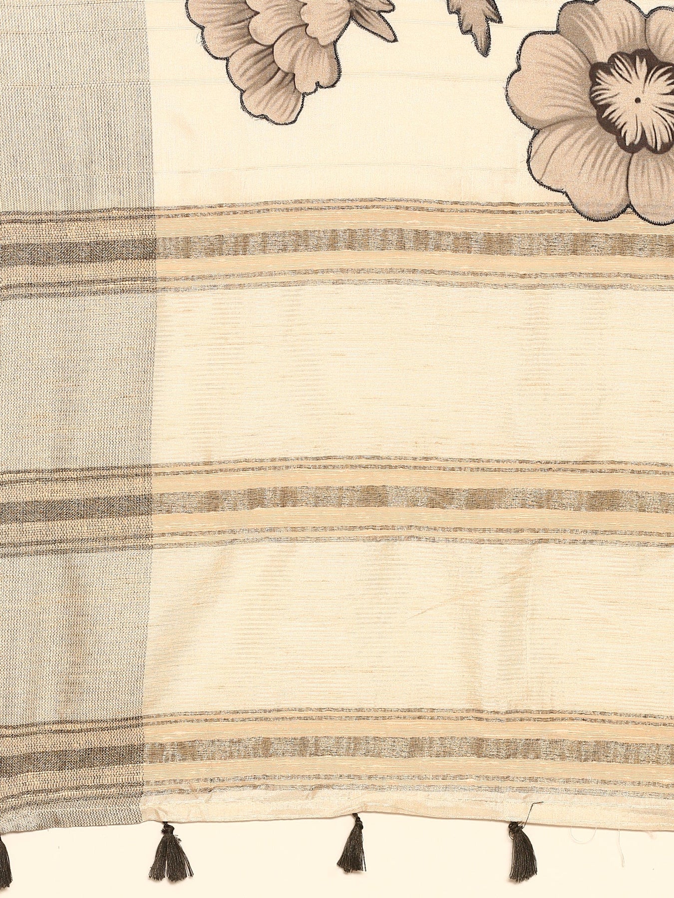 Elevate your elegance with this cream natural dupion saree, adorned with delicate floral prints. The rich texture of dupion silk combined with subtle floral motifs creates a timeless piece perfect for sophisticated occasions. Its soft cream hue complements a variety of accessories, making it versatile for both day and evening wear. Experience classic beauty and refined style with this graceful saree.