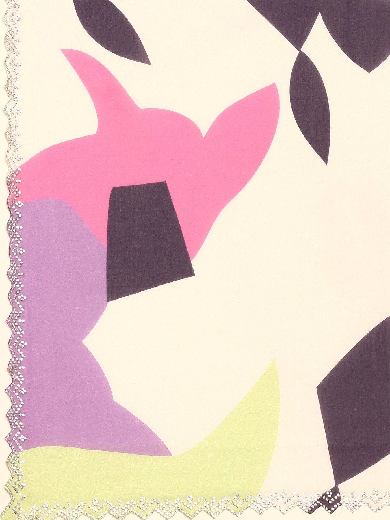 This cream and purple printed satin saree features exquisite Swarovski embroidery, adding a delicate sparkle to its luxurious fabric. Its smooth satin texture ensures a comfortable drape while the elegant color combination makes it perfect for festive occasions or special events. The saree blends traditional charm with modern glamour, helping you create a refined and graceful look.