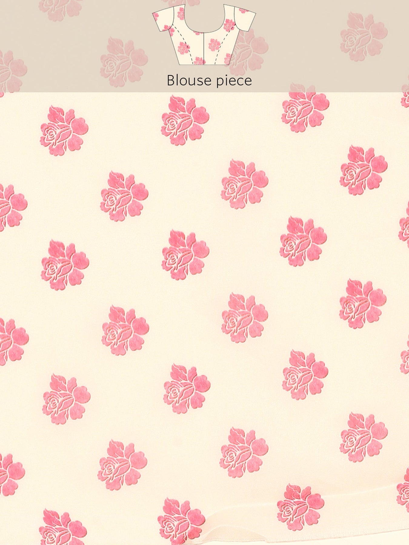 Cream Satin Saree With Pink Printed Motifs With Swarovski Embroidery