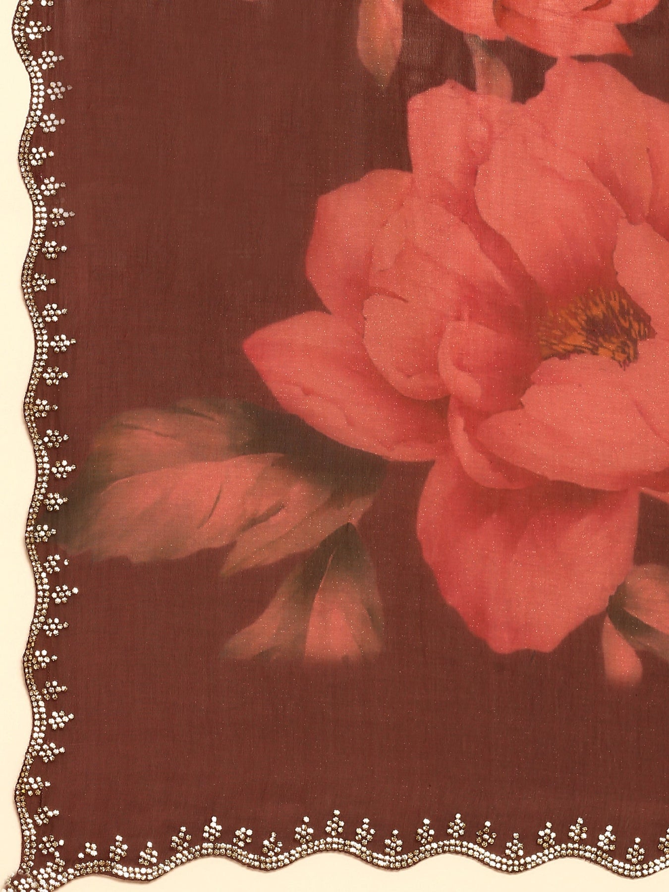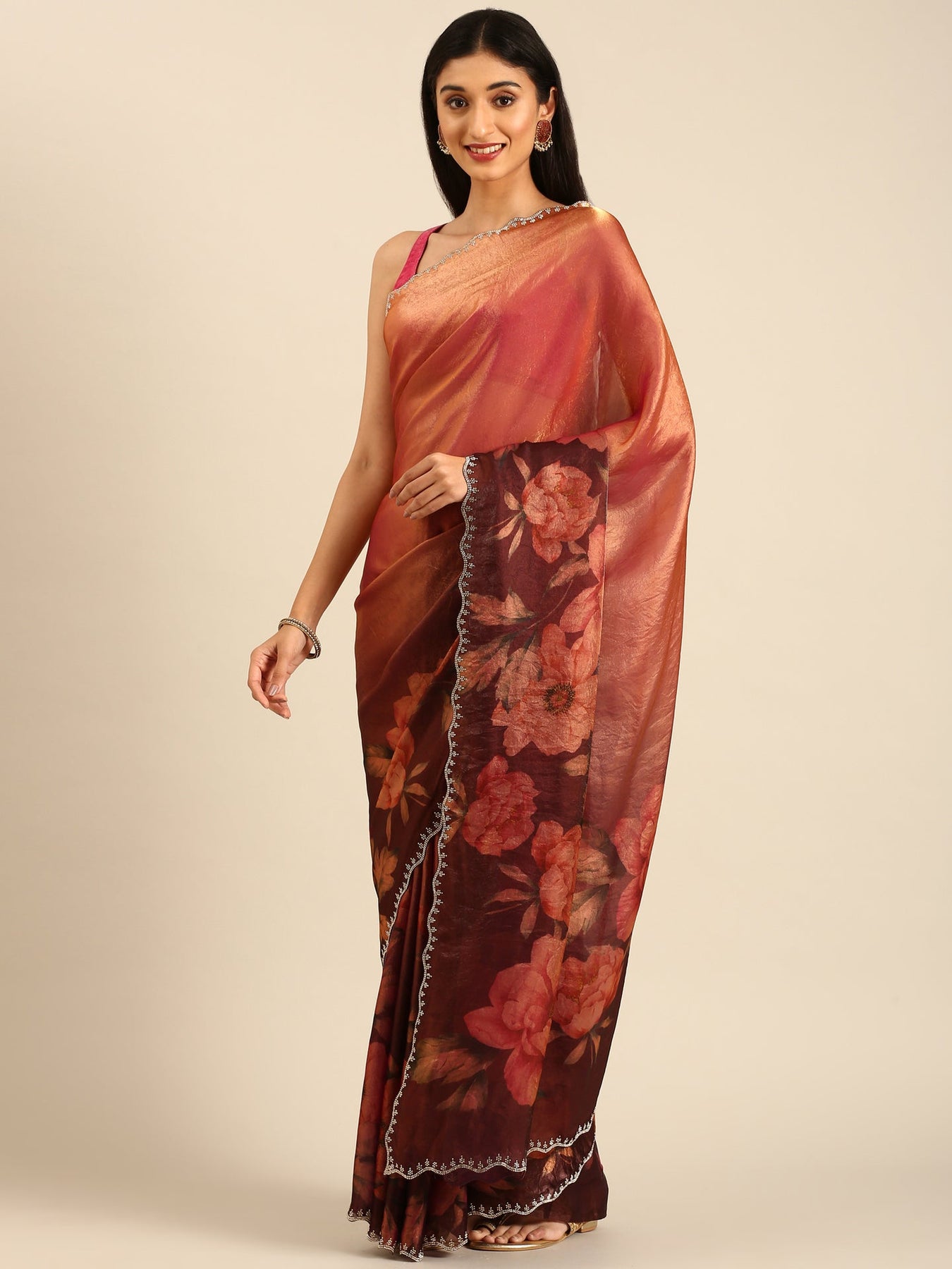 Celebrate elegance with this Gold & Maroon floral printed Jimmy tissue saree, beautifully enhanced by delicate Swarovski embroidery. The lightweight Jimmy tissue fabric ensures comfortable wear, while the intricate floral design and sparkling accents add a refined charm to your ensemble. Perfect for special occasions, this saree combines traditional craftsmanship with a touch of glamour to help you shine effortlessly.