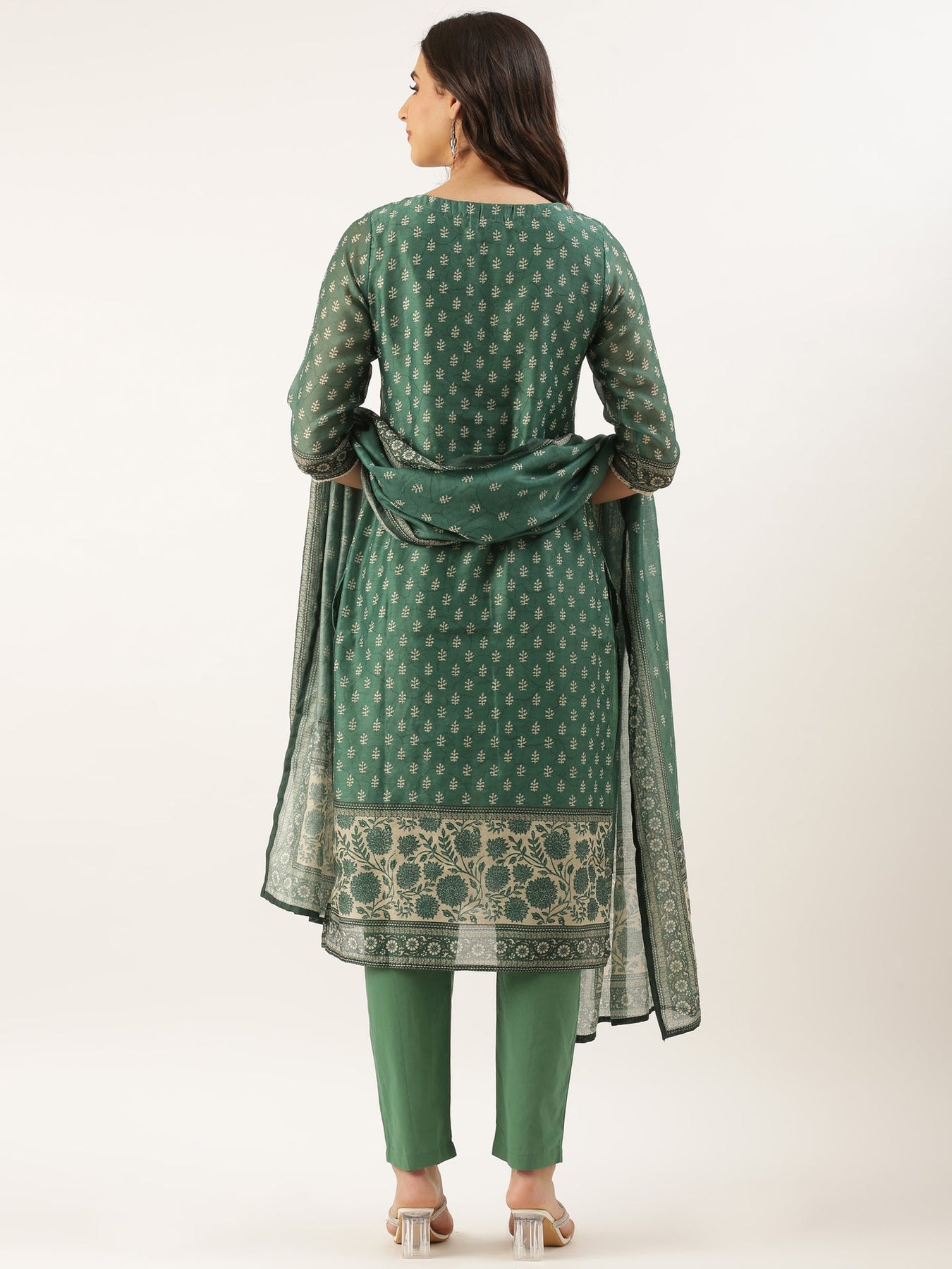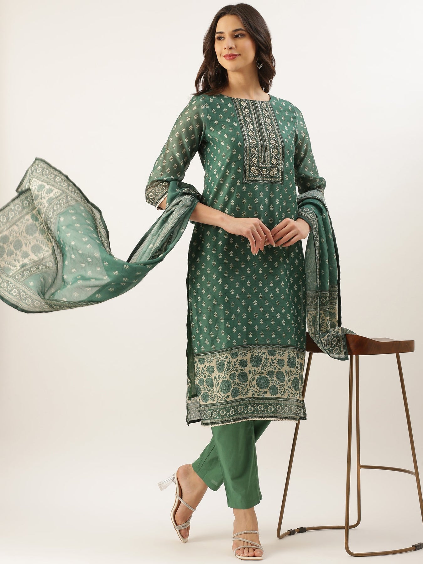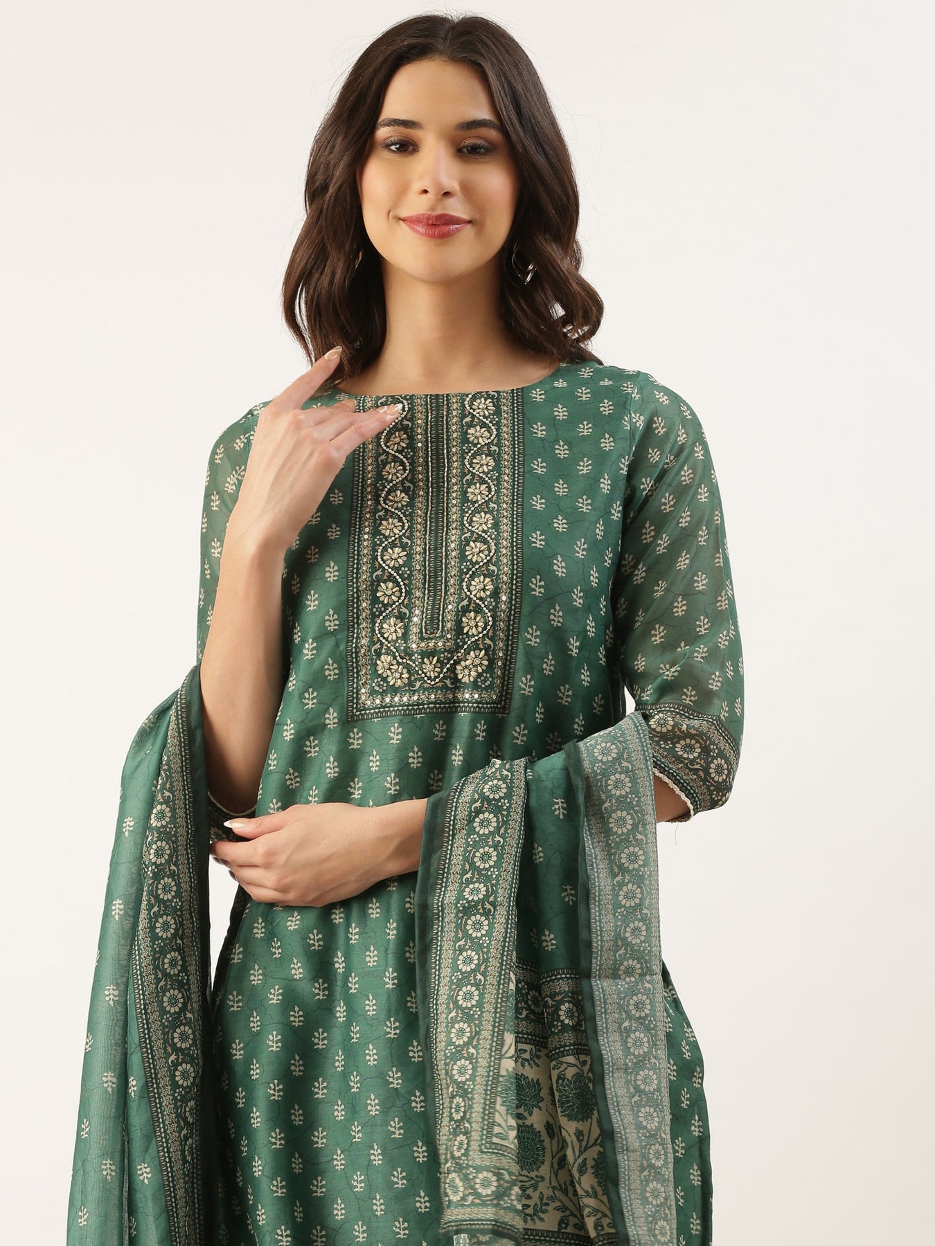 This green organza three-piece suit set blends elegance with delicate charm. The lightweight organza fabric features a subtle printed design, perfect for sophisticated occasions. With its coordinated top, bottom, and matching dupatta, the ensemble offers a graceful silhouette and comfortable wear, making it an exquisite choice for refined style.