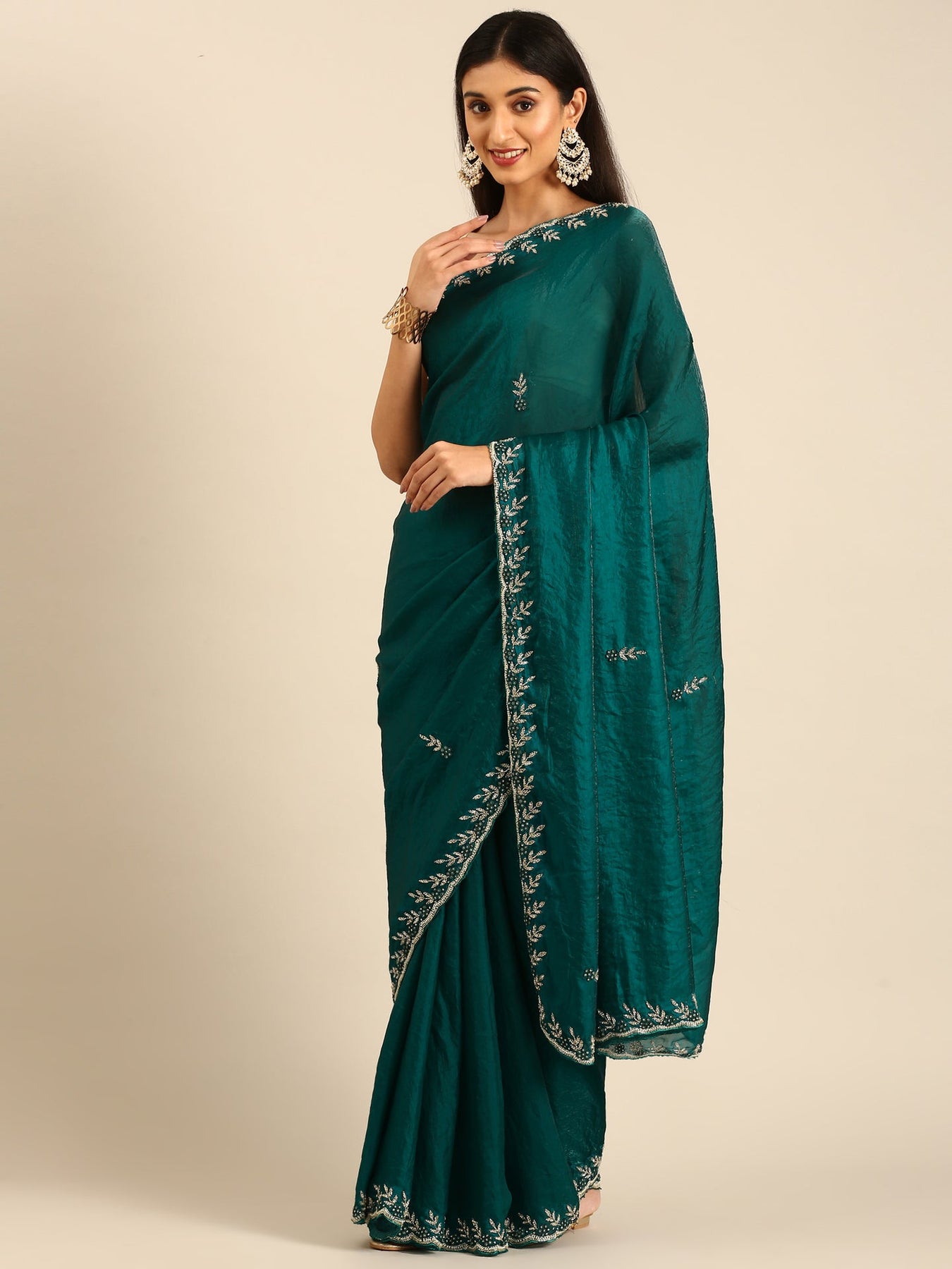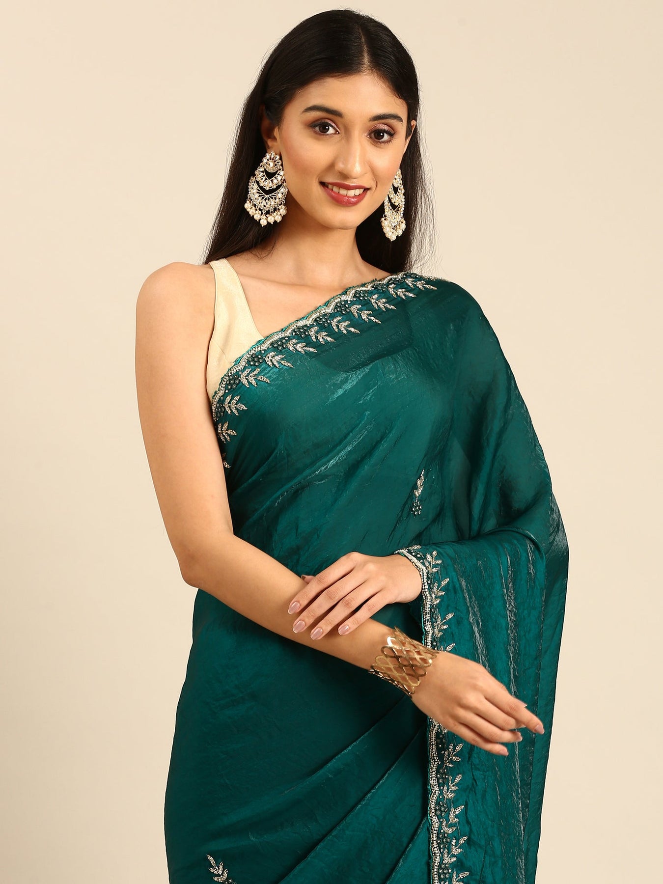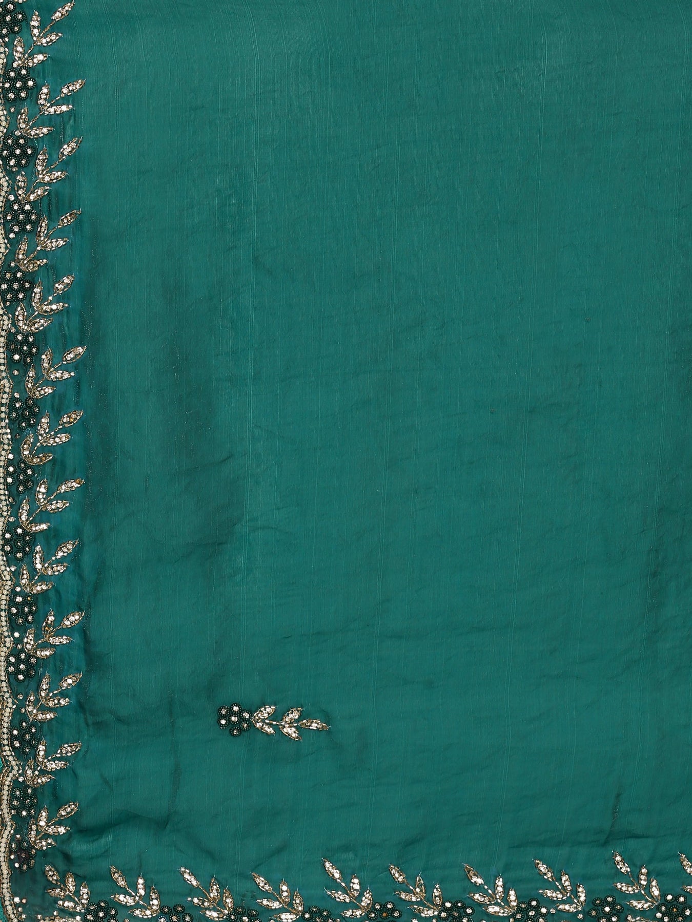 This exquisite green shimmer tissue saree showcases expert craftsmanship with its intricate cut Dana patterns complemented by dazzling Swarovski embroidery. The lightweight, finely woven fabric offers a delicate shimmer that enhances the saree's elegance. Perfect for upscale occasions, this saree combines traditional textile artistry with sophisticated embellishments, ensuring a refined and graceful appearance.