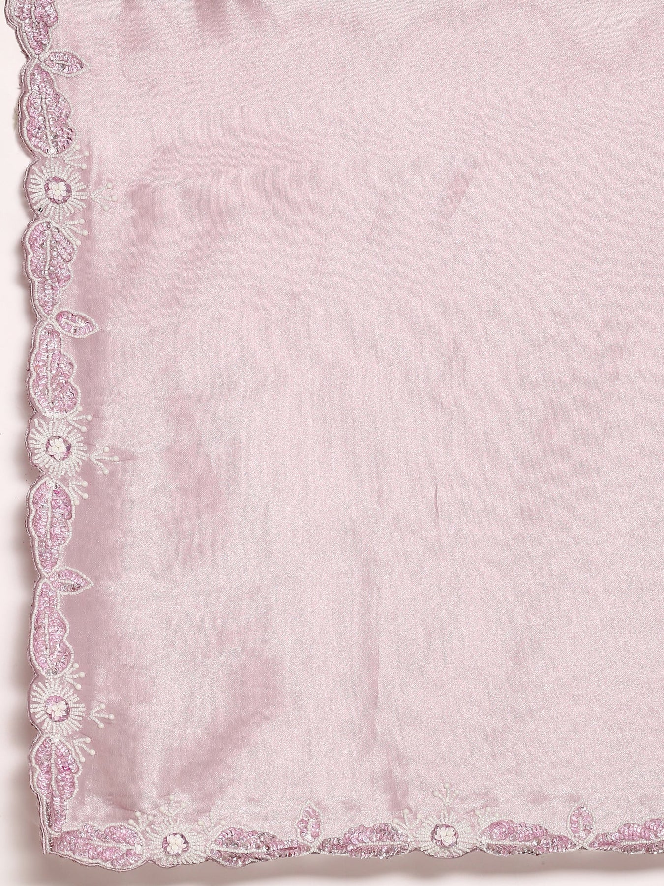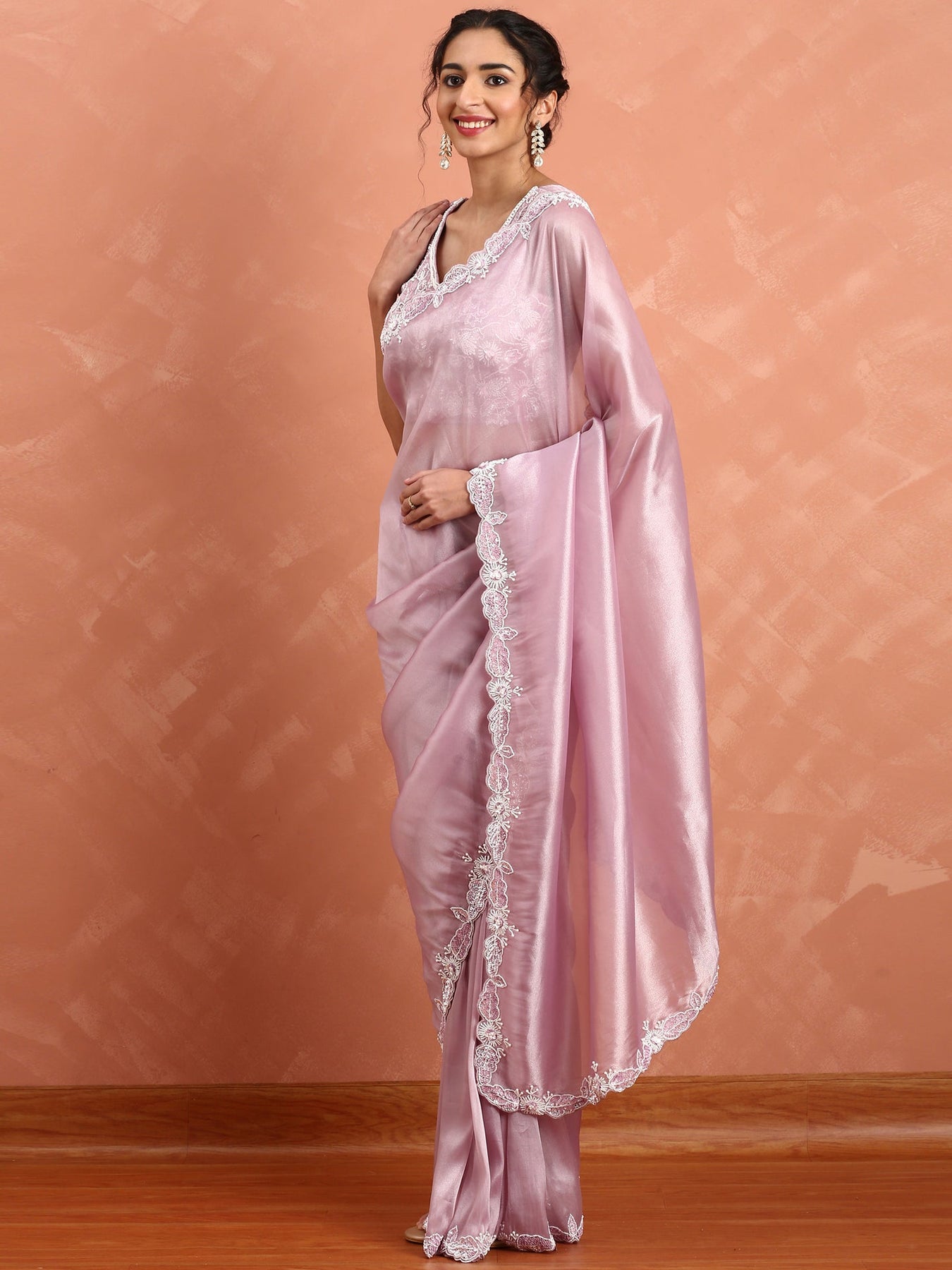 Lilac Jimmy satin tissue saree with pearls & sequin embroidery with ready made blouse
