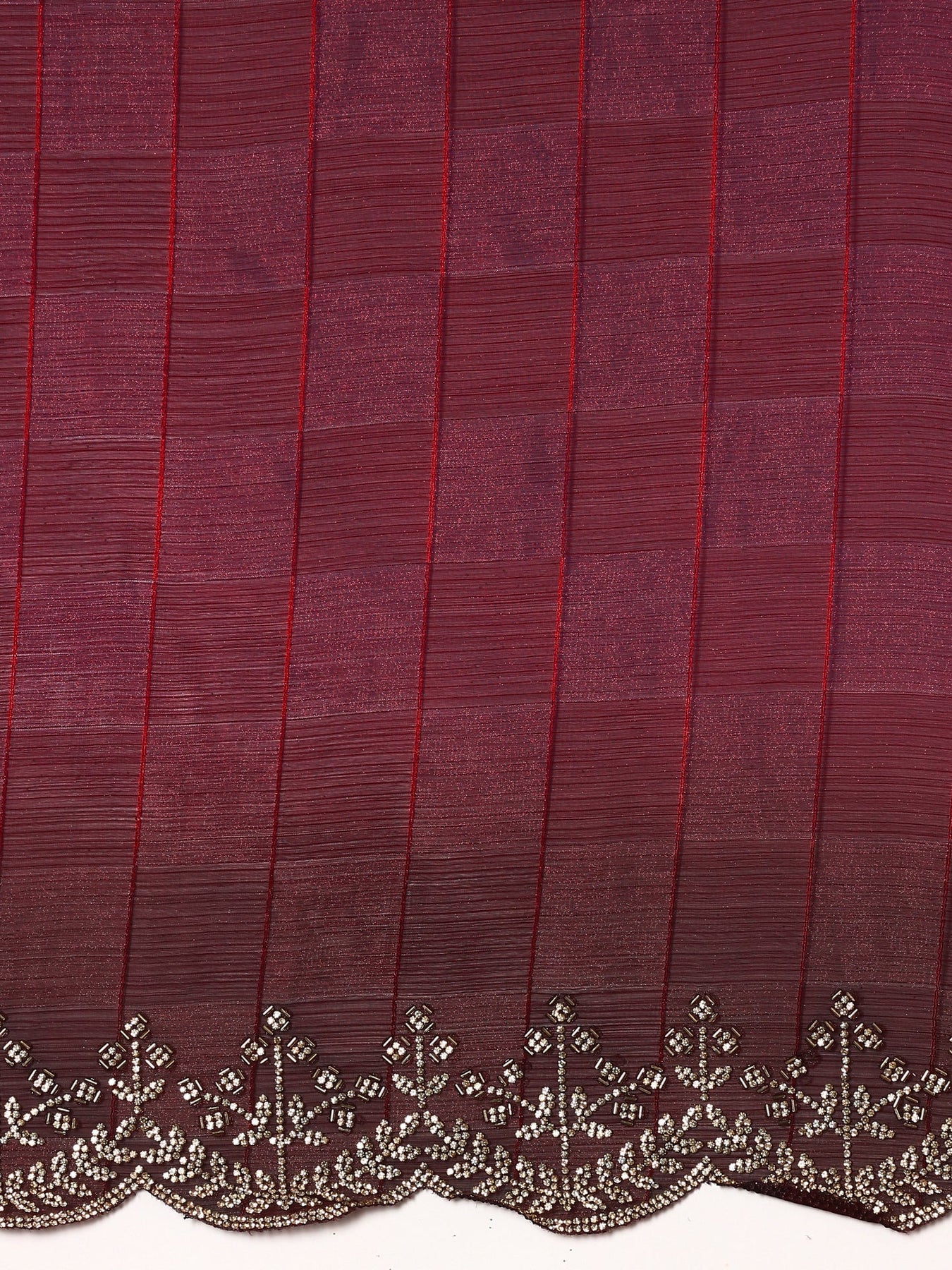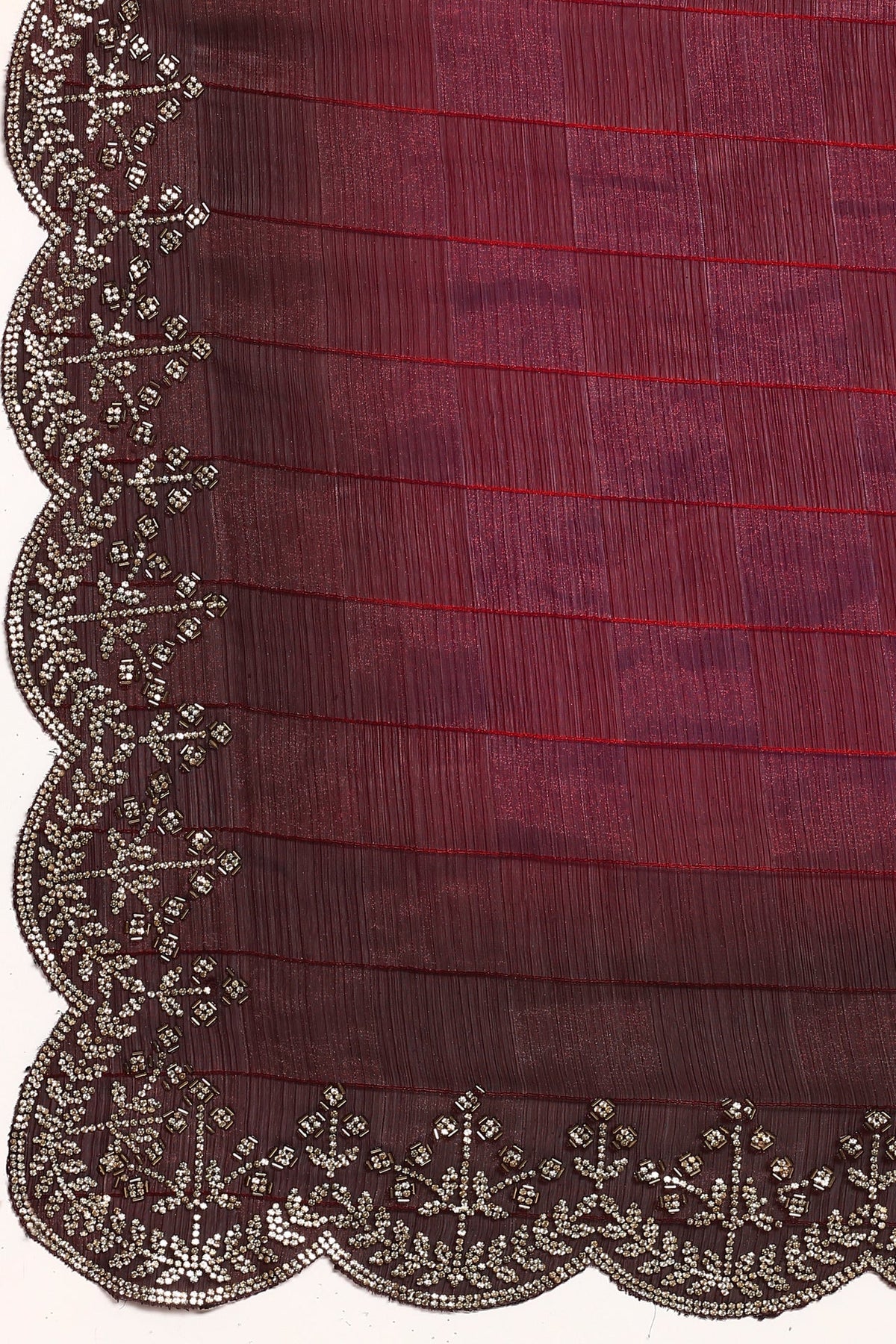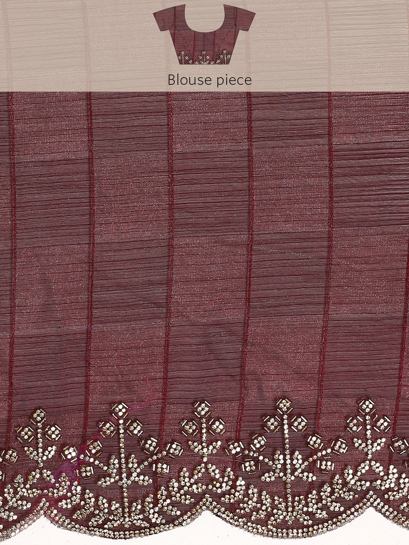 Elevate your elegance with this maroon jacquard satin organza saree, featuring exquisite hand embroidery. The rich jacquard pattern blends seamlessly with the lustrous satin organza, creating a delicate yet striking texture. Meticulously crafted hand embroidery adds a refined touch, making it perfect for special occasions and celebrations. This saree offers a graceful drape that complements your silhouette with sophistication and timeless charm.