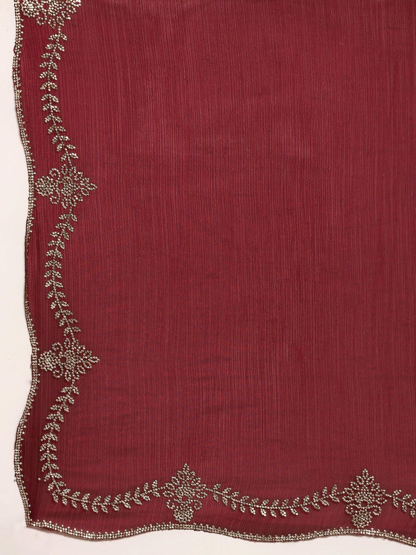 This mahroon jimmy tissue saree features exquisite cut Dana hand embroidery, blending traditional craftsmanship with elegant fabric. Its rich color and detailed work make it perfect for festive occasions, offering a graceful look that enhances your style with comfort and sophistication.