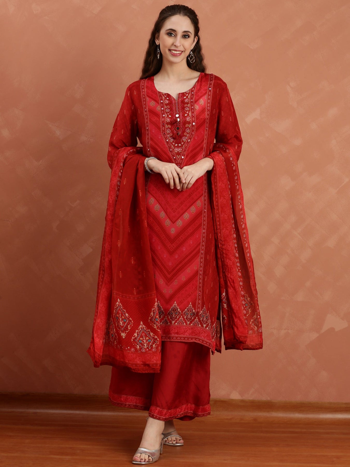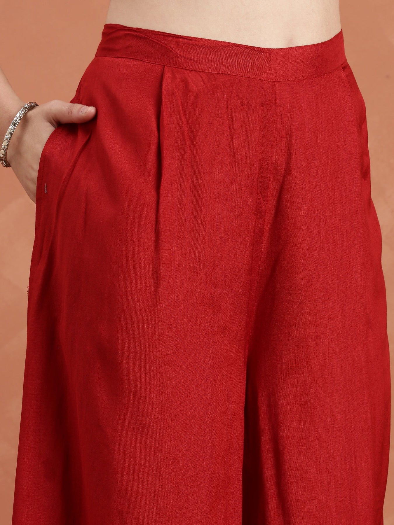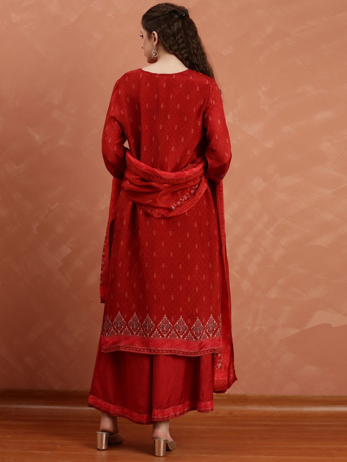 Elevate your wardrobe with this Maroon Crepe Printed Three Piece Suit Set, thoughtfully designed for elegance and comfort. Crafted from soft crepe fabric, it features intricate prints that add subtle artistry to your look. This versatile set includes a kurta, matching bottoms, and a coordinating dupatta, creating a harmonious ensemble perfect for formal occasions or refined everyday wear. Experience a blend of tradition and modernity with every wear.