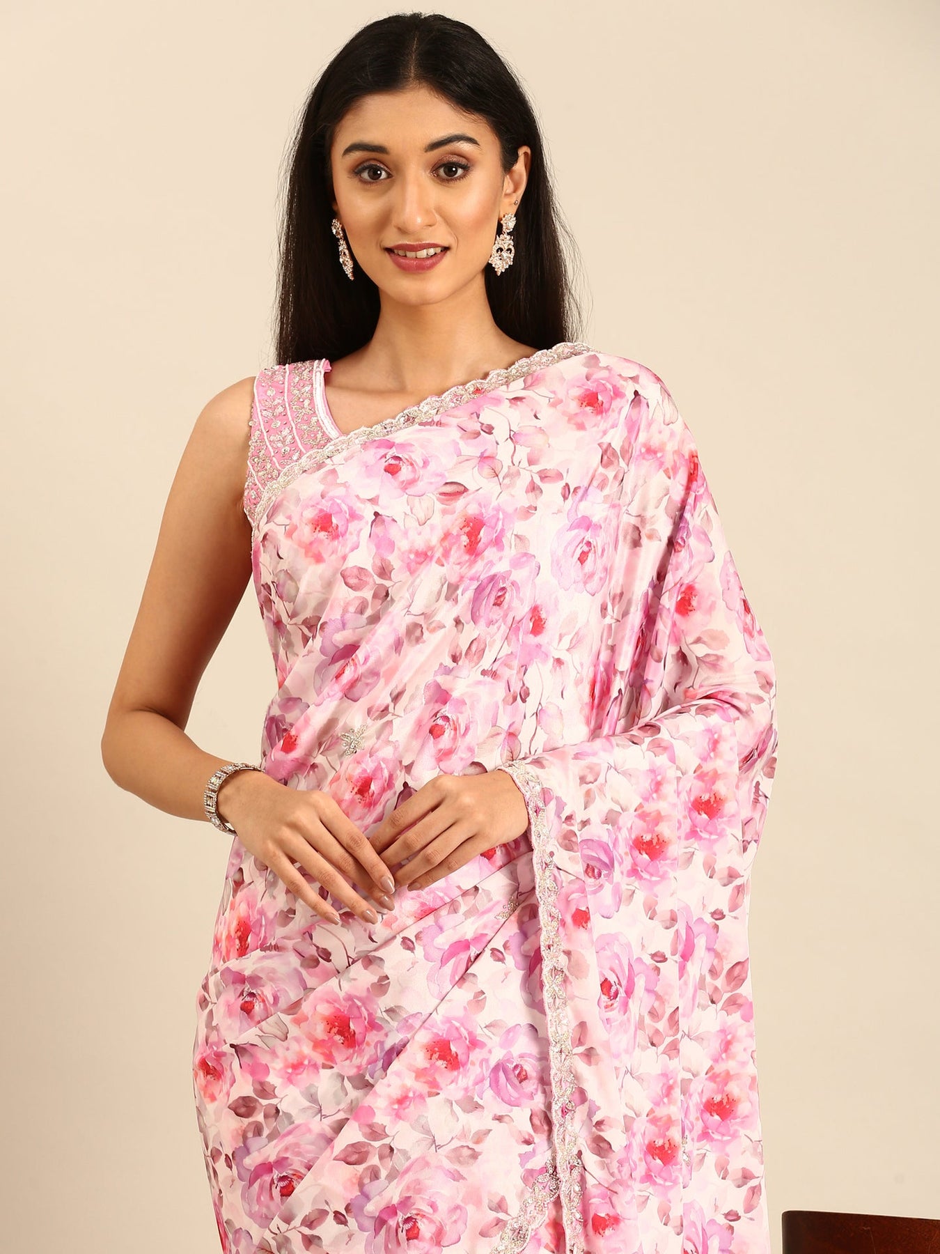 Pink floral printed satin saree with pearls & sequins embroidery with heavy ready made blouse