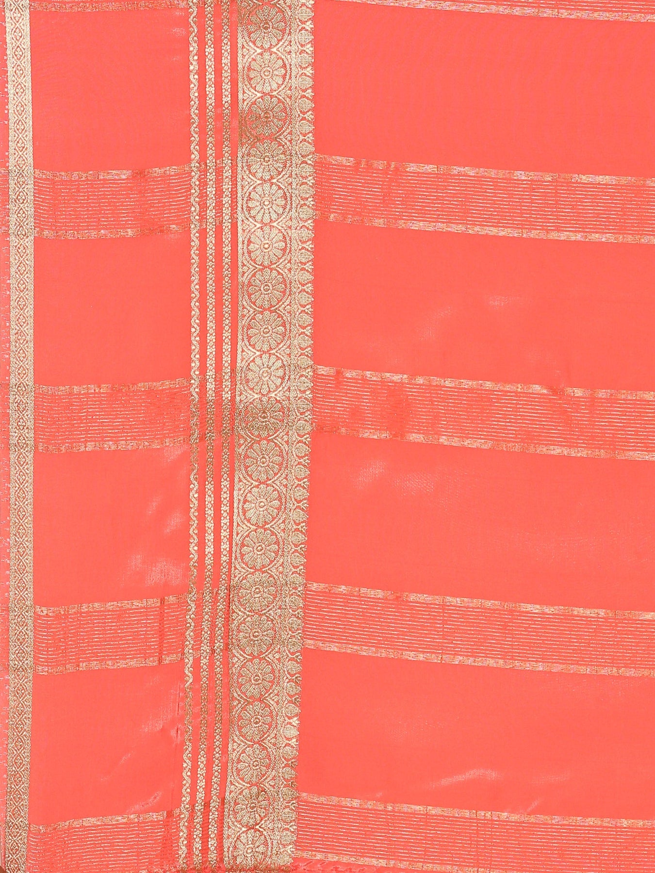 Discover the elegance of the Pink Mysore crepe saree, featuring a refined Zari contrast border that adds a timeless charm. Crafted from smooth Mysore crepe, this saree drapes beautifully, offering both comfort and a graceful silhouette. Ideal for formal occasions, its understated sophistication enhances your presence with subtle luxury.