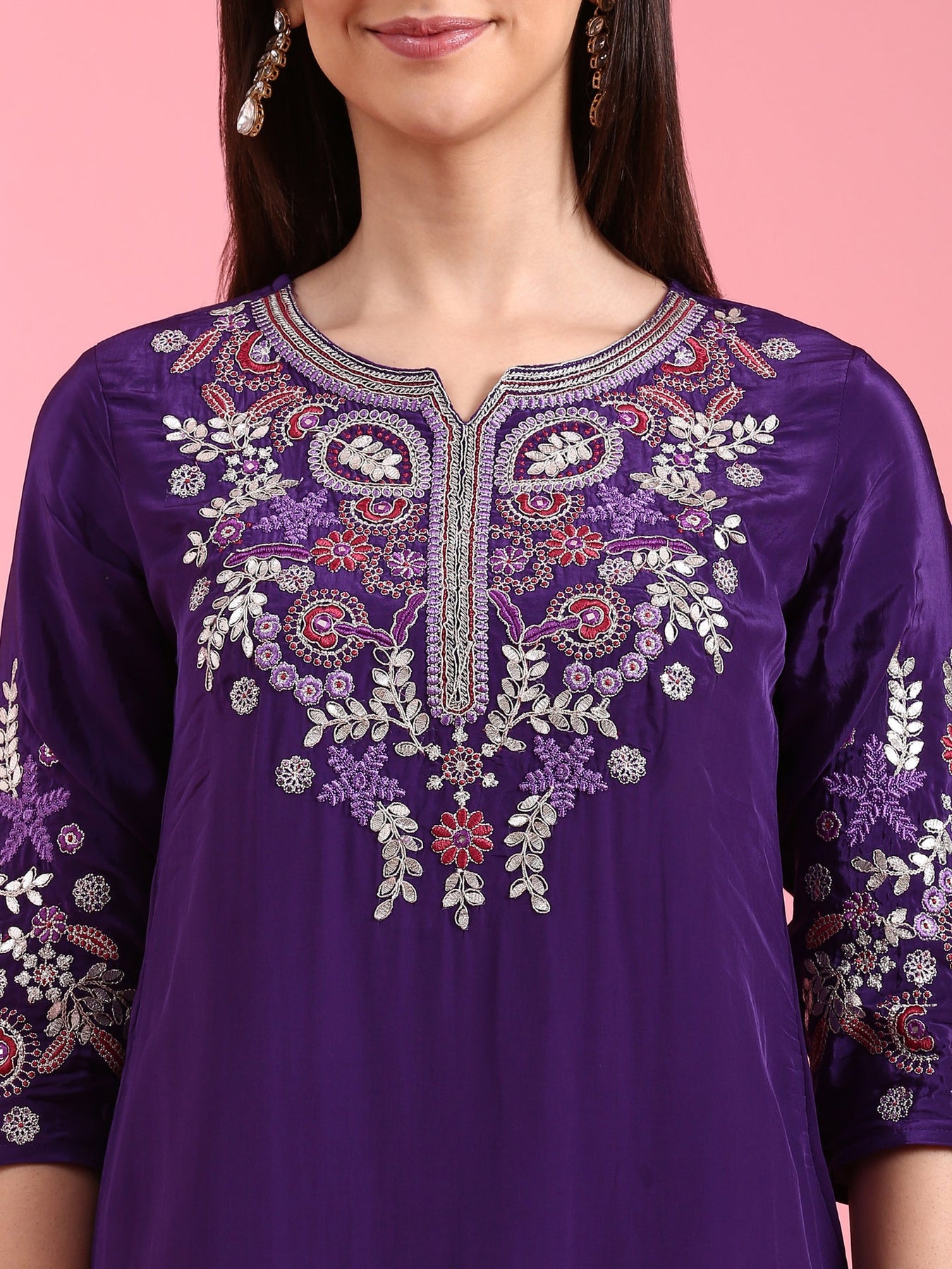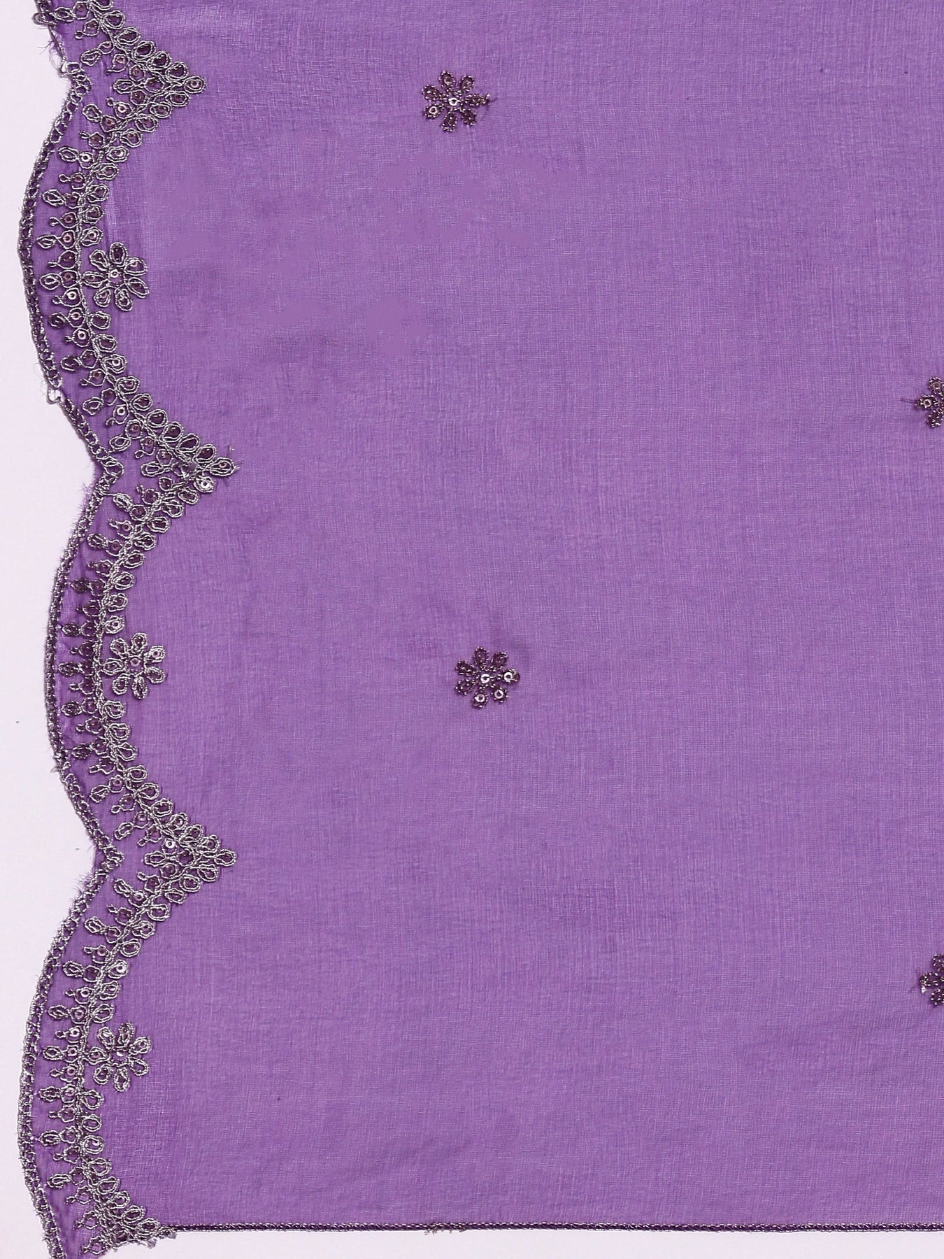 Elevate your wardrobe with this Purple Crepe Embroidery Three Piece Suit Set, featuring exquisite embroidery that adds subtle elegance. Crafted from soft crepe fabric, it offers comfort while maintaining a refined silhouette. This set seamlessly combines style and grace, perfect for formal occasions or sophisticated gatherings.